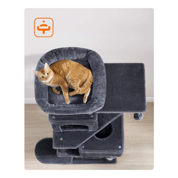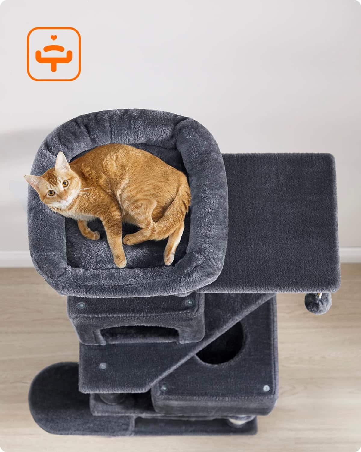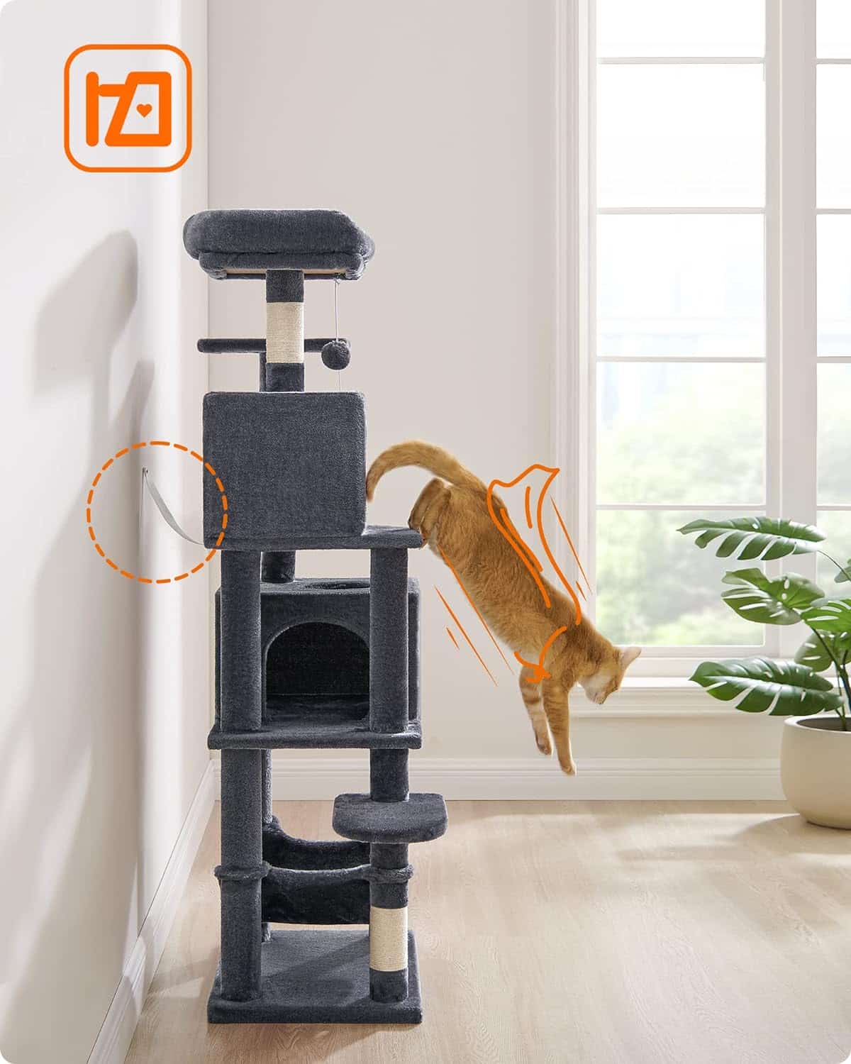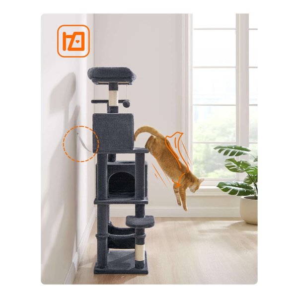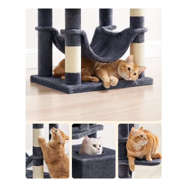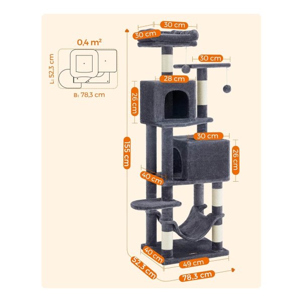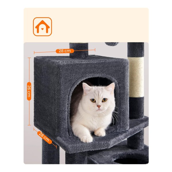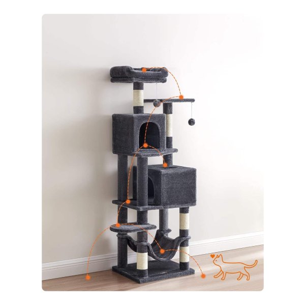 Krabpaal, 155 cm hoog, kattenboom met 5 krabzuilen, 2 platforms, 2 kattenholletjes, hangmat, 2 pluche ballen, pluche, design met meerdere verdiepingen, rookgrijs