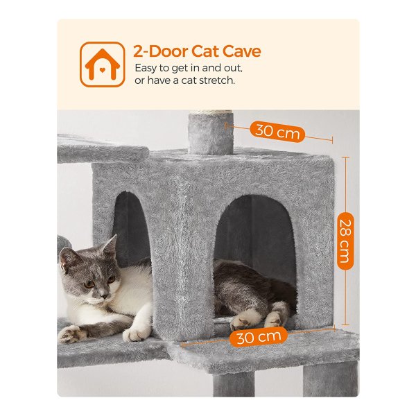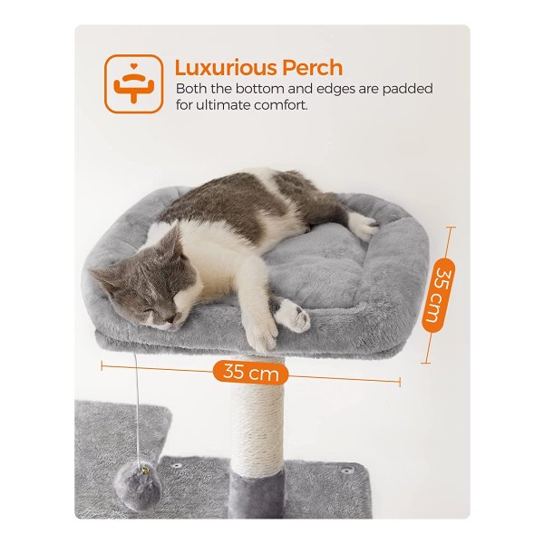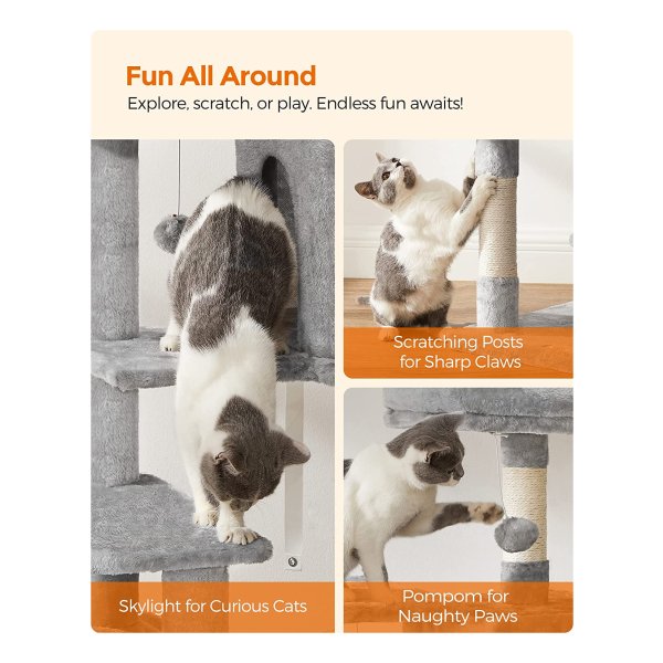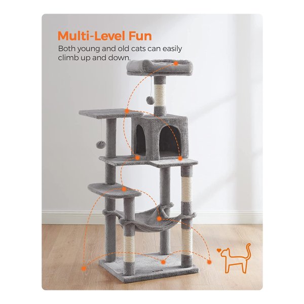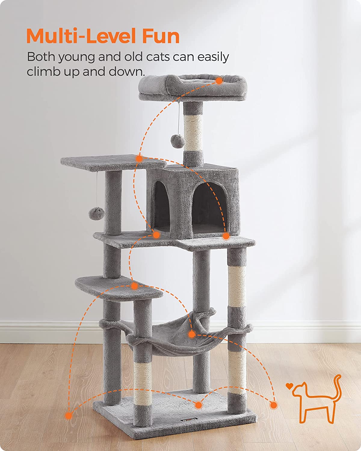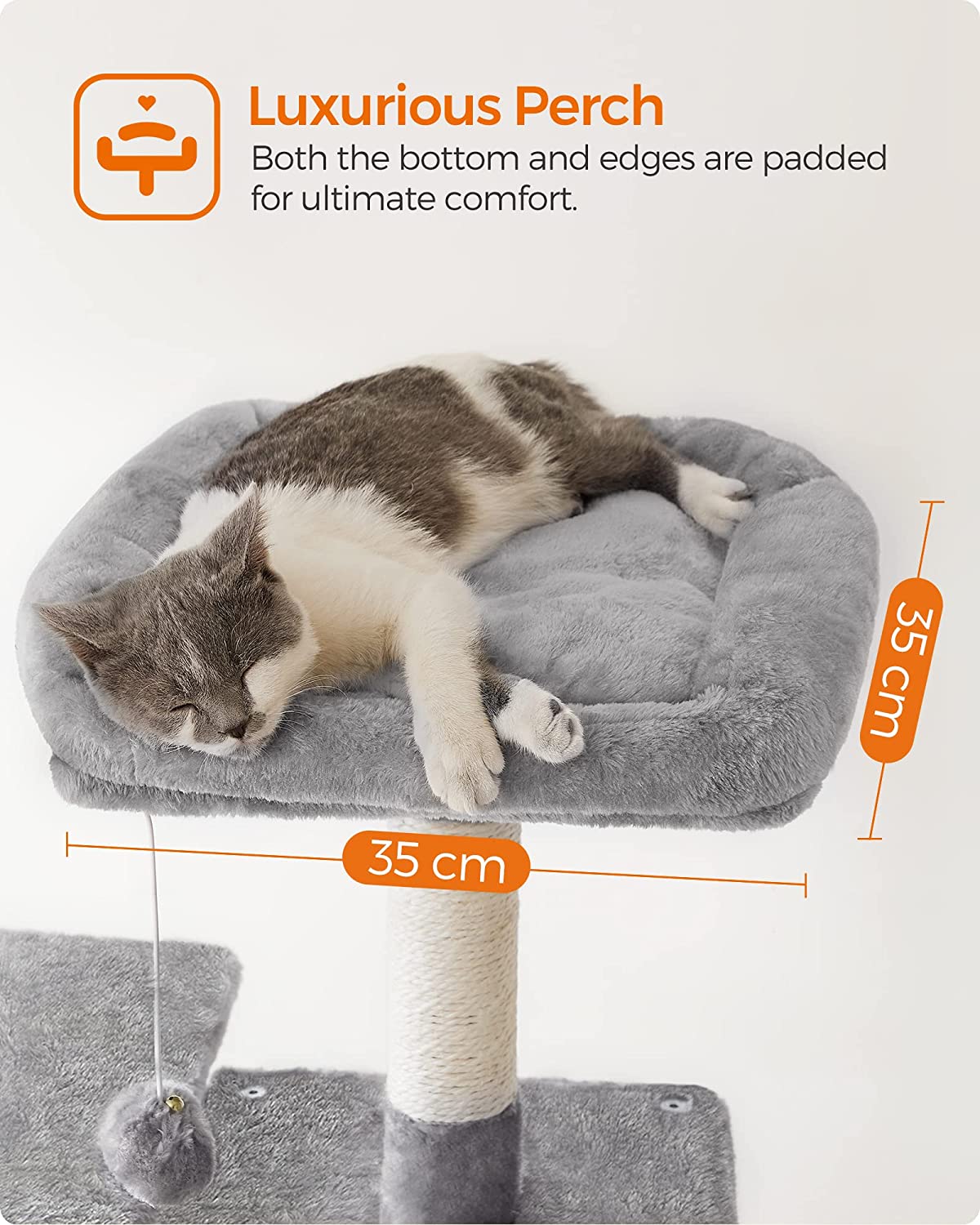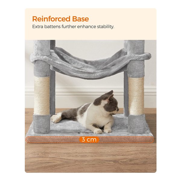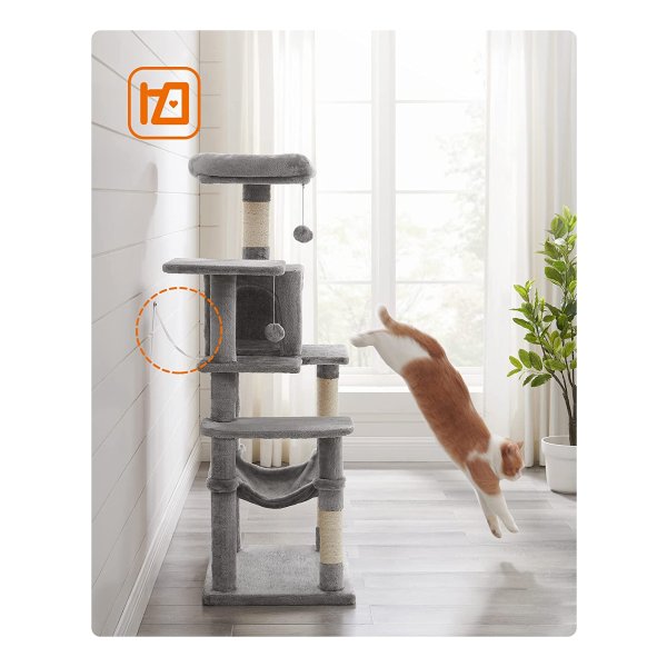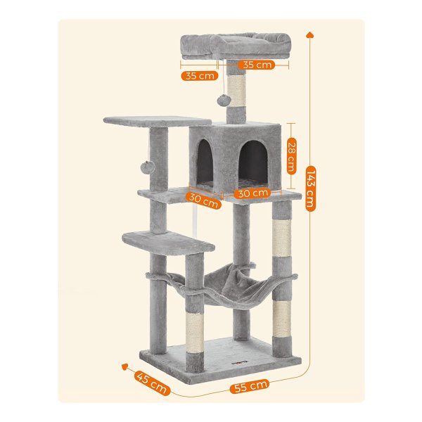 “Een boom?” Ja, katje, dat is geen droom. Wij weten dat je graag vanuit het raam naar de bomen kijkt. Nu heb je een krabpaal voor jou. De knuffelholte in de boom geeft je een gezellige plek waar je je kunt terugtrekken en uitrusten “Wildes rondspringen?” Geen probleem. Met een versterkte bodemplaat en een extra kantelbeveiliging beschikt deze krabpaal over extra stabiliteit, zodat je je kunt uitleven. Je kunt zelfs twee kattenvrienden uitnodigen (elk max. 5 kg “Een uitstekende ontspanningsplek?” Natuurlijk. Heb je al de hangmat onderaan gezien? Heel zacht. Je kunt erin liggen en je ontspannen. Wil je wat plezier, niet alleen luien? Dat is het moment van de bontbal boven te glanzen! “Gecompliceerde montage?” Maak je geen zorgen. Dankzij de duidelijke handleiding en de gemarkeerde onderdelen kan je eigenaar deze krabpaal snel voor jou opbouwen. Je hoeft niet lang te wachten om je nieuwe rijk aangeboden te krijgen “Niet meer alleen?” Met zo’n krabpaal heb je veel te doen als je eigenaar niet thuis is: ontspannen, rekken, spelen… Bovendien voelt het zachte oppervlak aan als zijn knuffel! Productdetails: Kleur: lichtgrijs