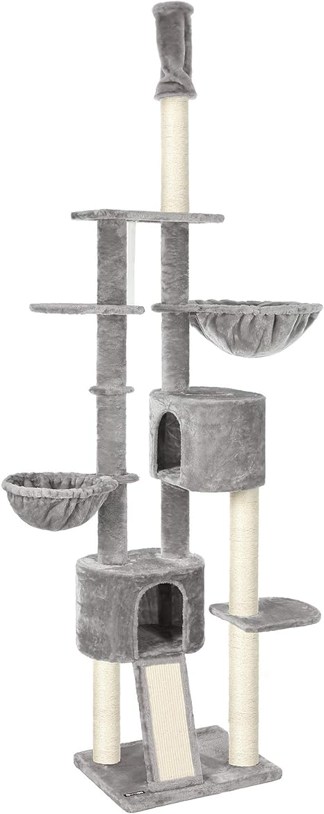 Een plafondhoog ontwerp voor katten die van hoge ruimtes houden. Verstelbare hoogte (2,4 tot 2,6 m) voor dekens van verschillende hoogten. 2 comfortabele knuffelgroten voor knuffelige katten. 2 zachte ligkommen voor comfortabele luifel. Krabplank en zuilen, om je bank tegen de klauwen te redden. Trapvormige opstelling voor gemakkelijk op- en afstijgen versterkt fundament van spaanplaat voor meer Stabiliteit