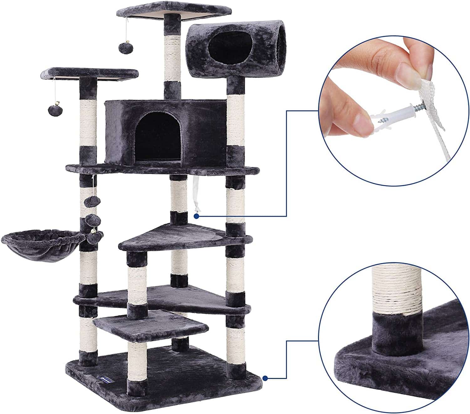 Dit klimtoestel brengt niet alleen ontspanning, maar ook veel plezier voor jouw katten. Met verschillende niveaus, een kattenvat en ballen met belletjes worden de katten uitgedaagd en gefascineerd. Ze zullen volgens hun natuur willen springen en spelen op dit klimtoestel.