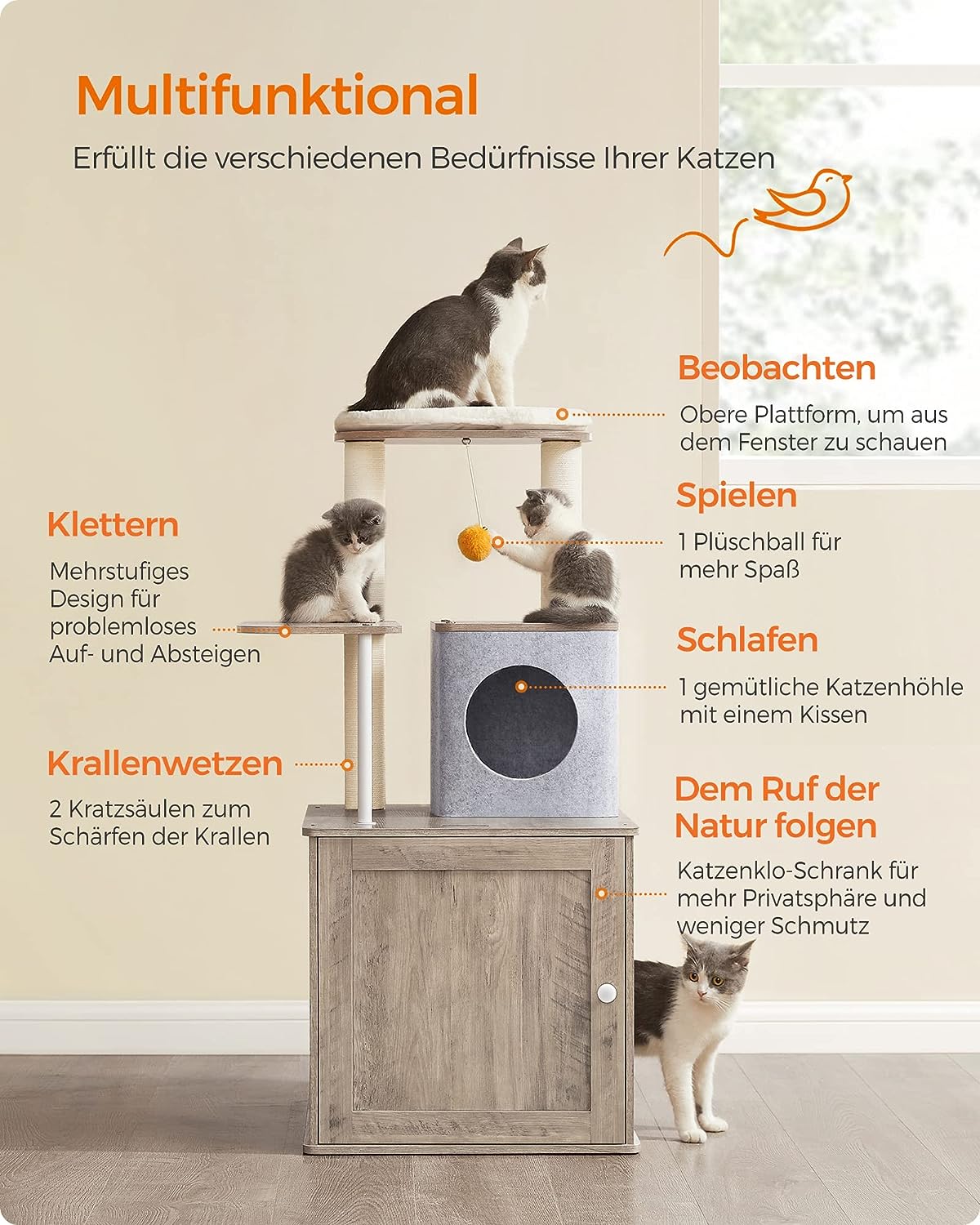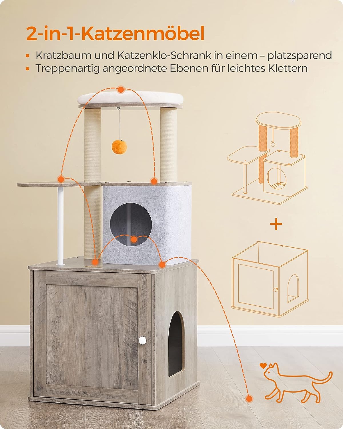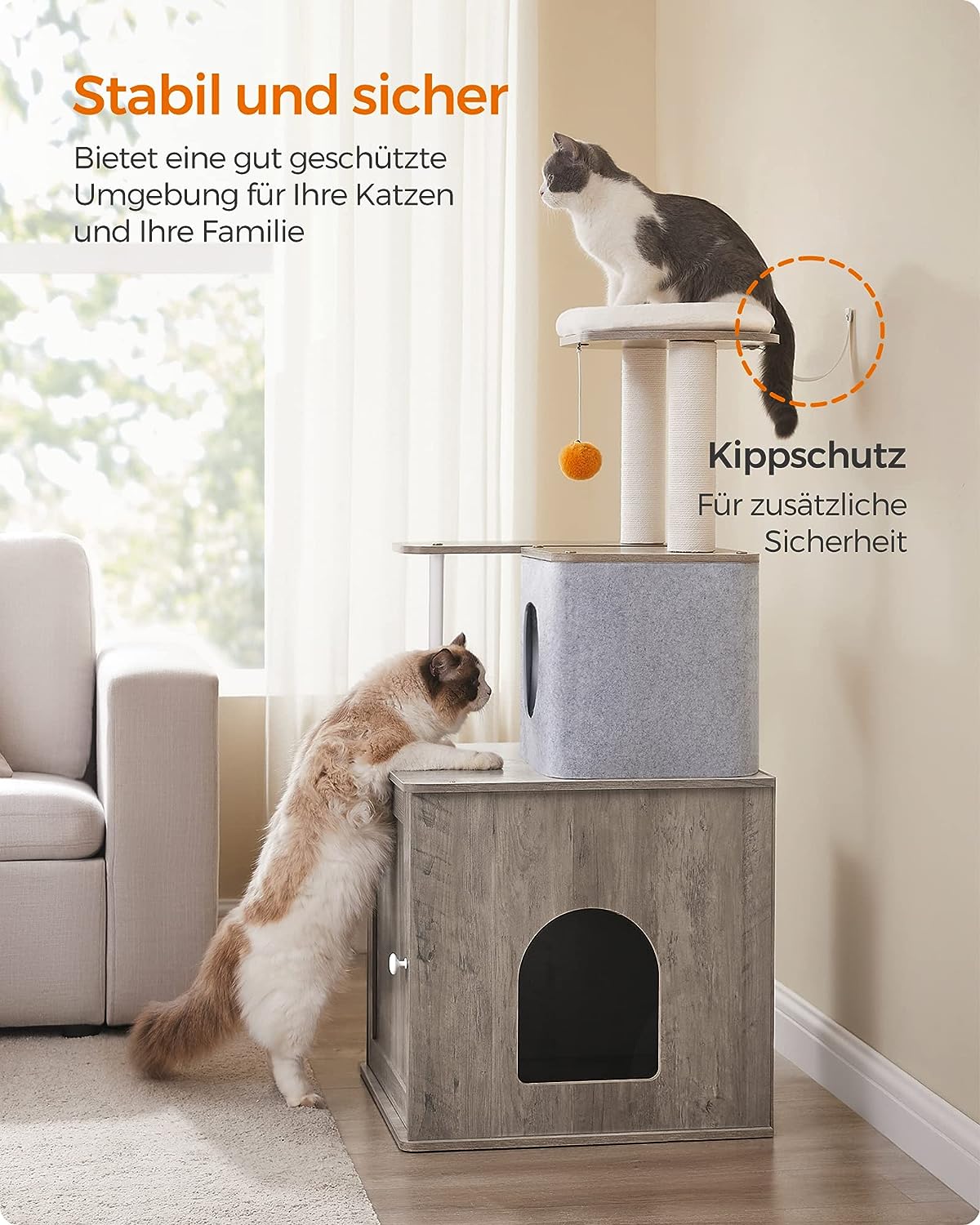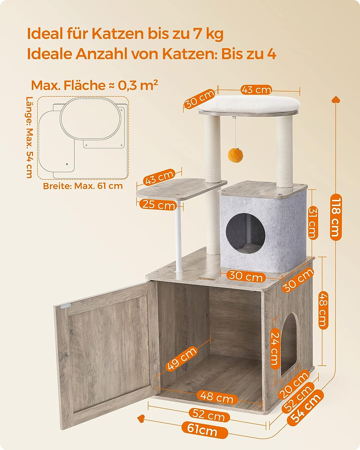 Krabpaal Met Kattenbakkast, 2-İn-1 Moderne Kattenboom, 118 Cm Hoog, 2 Krabzuilen, Knuffelhol, Wasbare Kussens, Greige