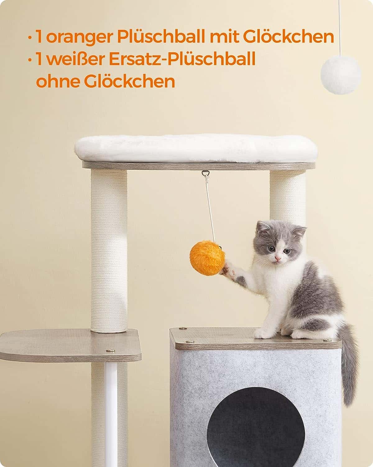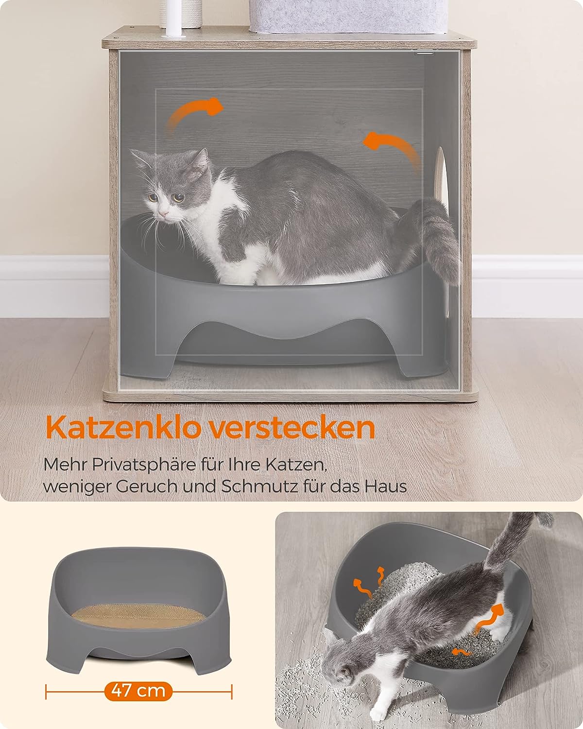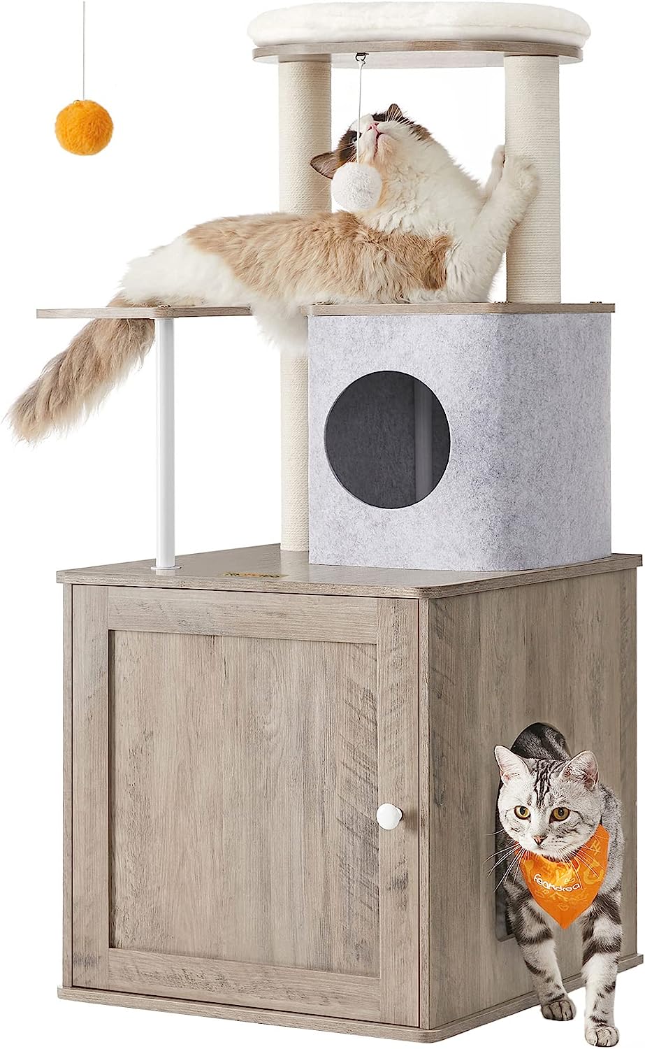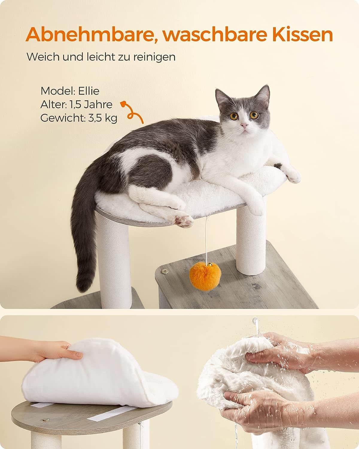 Krabpaal Met Kattenbakkast, 2-İn-1 Moderne Kattenboom, 118 Cm Hoog, 2 Krabzuilen, Knuffelhol, Wasbare Kussens, Greige