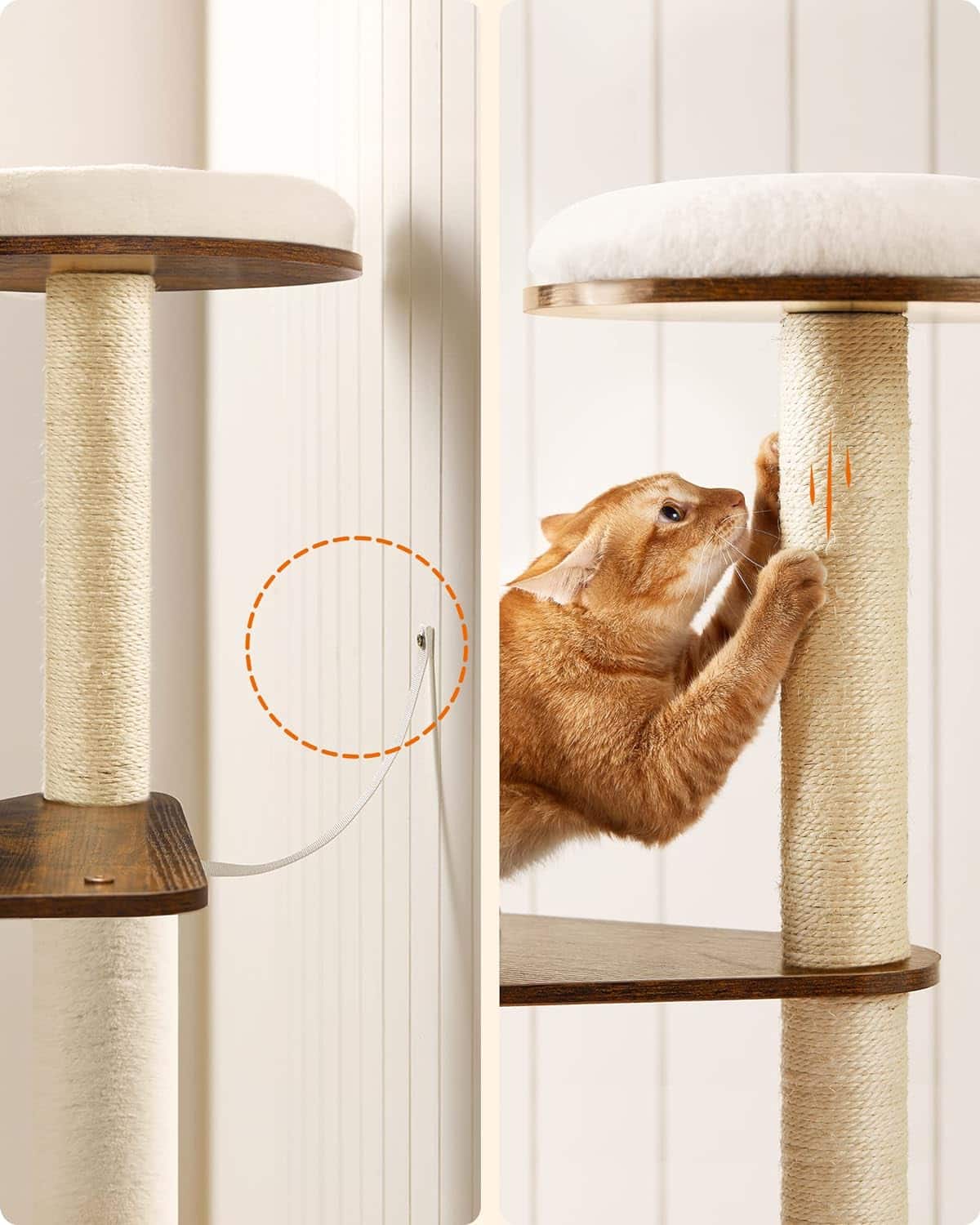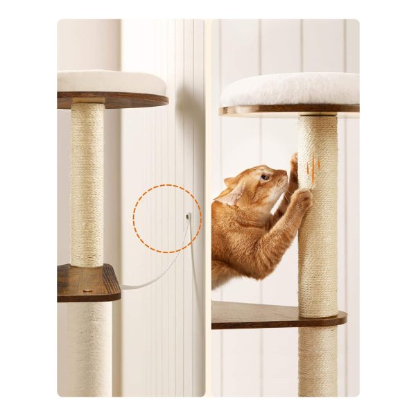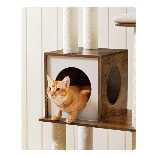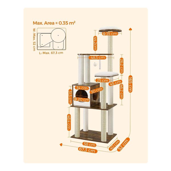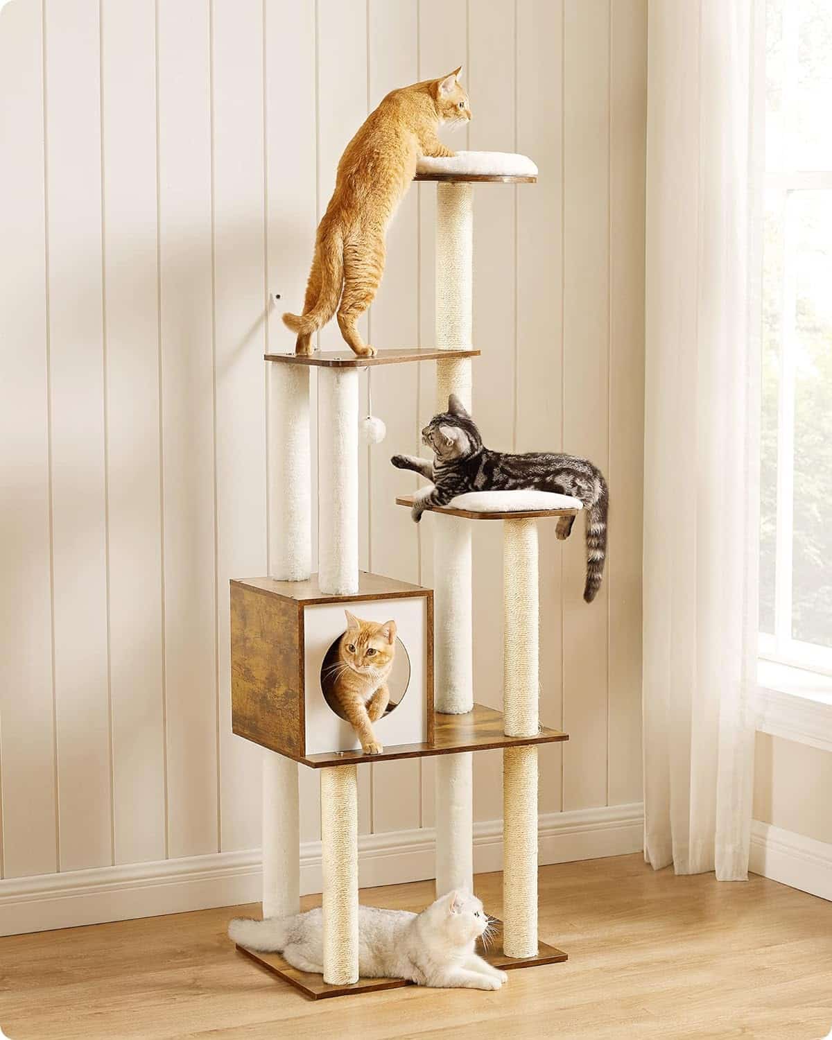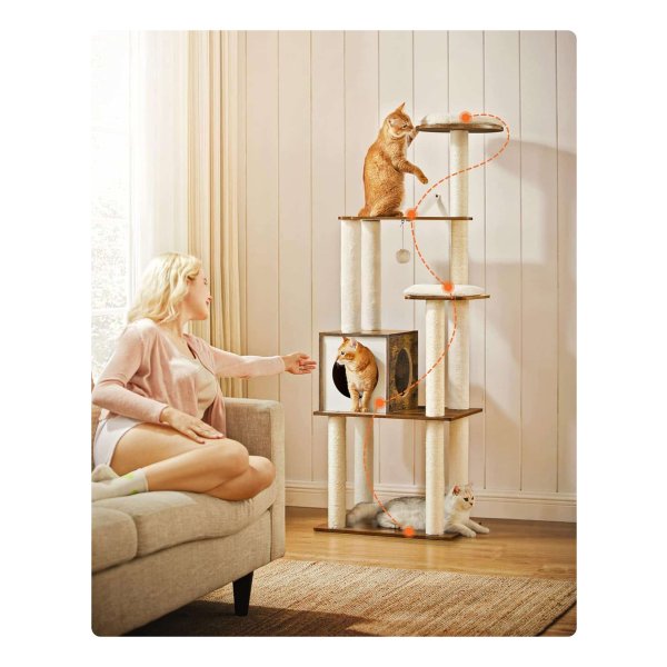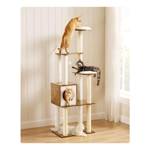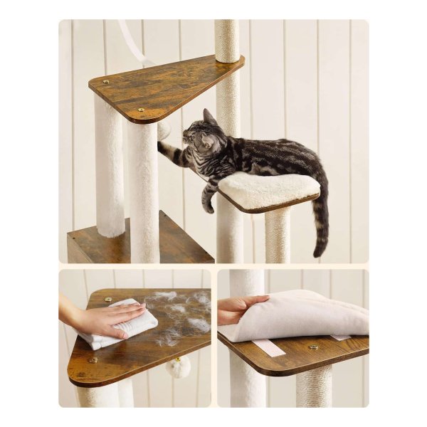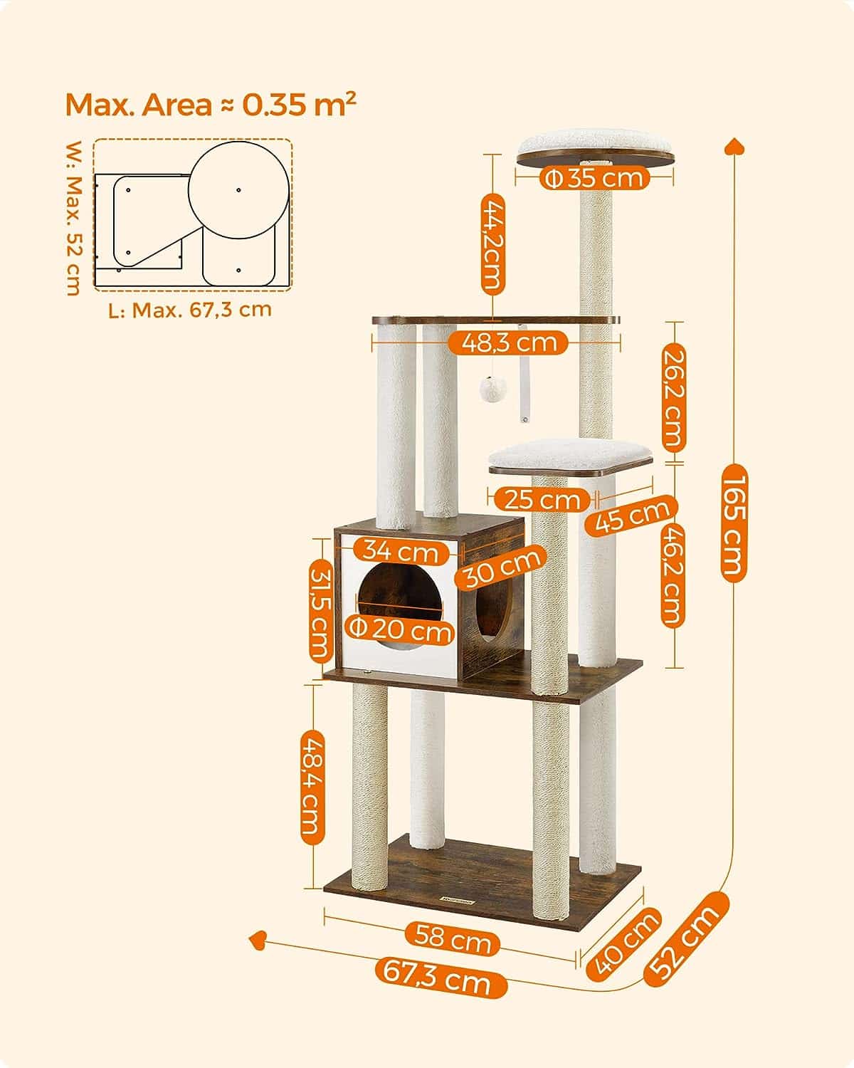 Krabpaal voor katten, moderne kattentoren, kattenwoning met 5 krabpalen, wasbare afneembare kussens, zitstang, kattenmand, kattenmeubel voor huiskatten, 165 cm hoog, vintage bruin