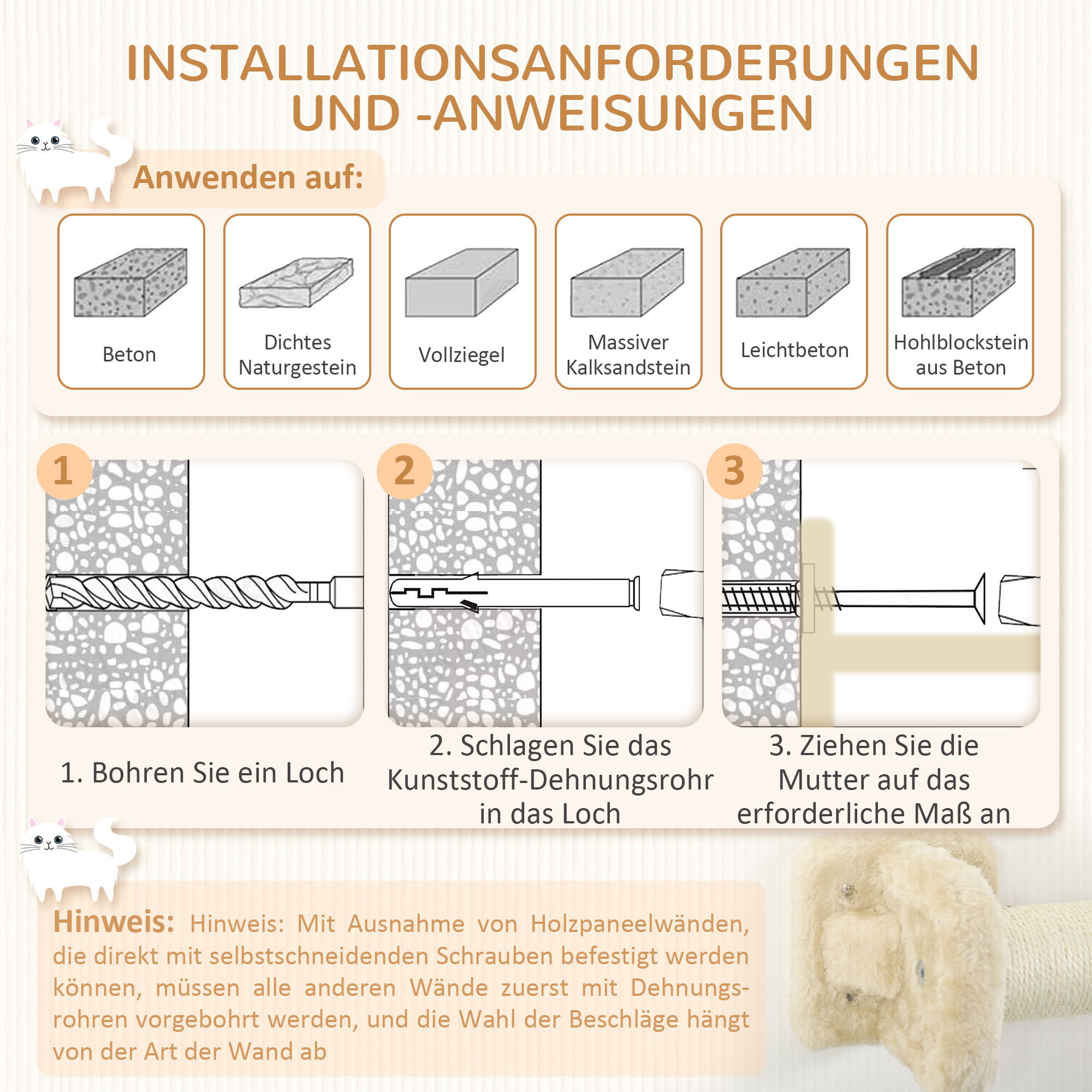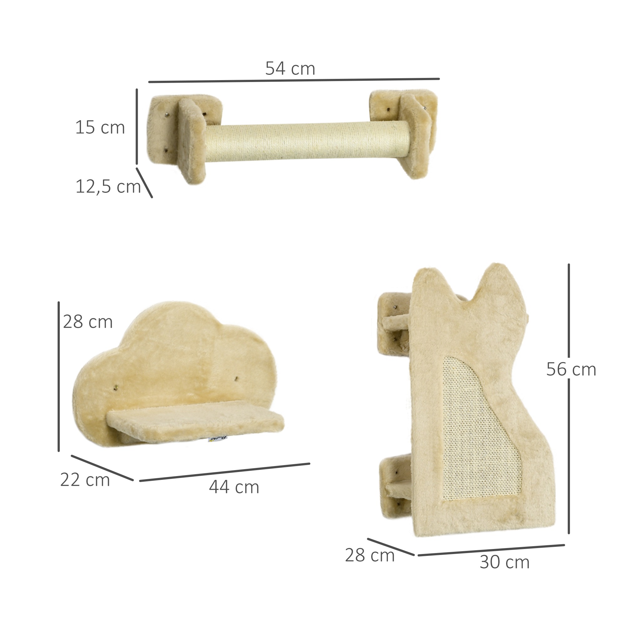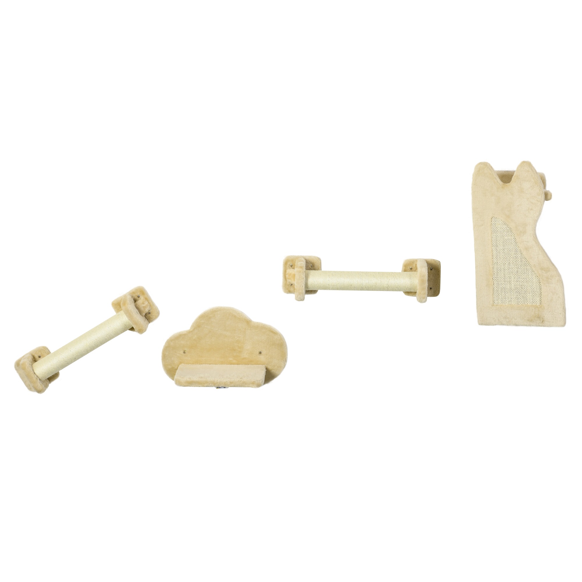 | Bullet Point 2 | Deze PawHut katten trap set biedt uw huisdier een mooie, hoge plek om te spelen en te ontspannen. Het ontwerp omvat een platform voor dutjes, een krabplank en twee traptreden, allemaal bevestigd aan de muur om vloeroppervlak te besparen. Gemaakt van duurzaam spaanplaat voor stabiliteit en draagkracht. Het beige kleurenschema past goed in elk interieur. Montage is vereist. Aanbevolen gewicht tot 5 kg, draagkracht van 8 kg. |
