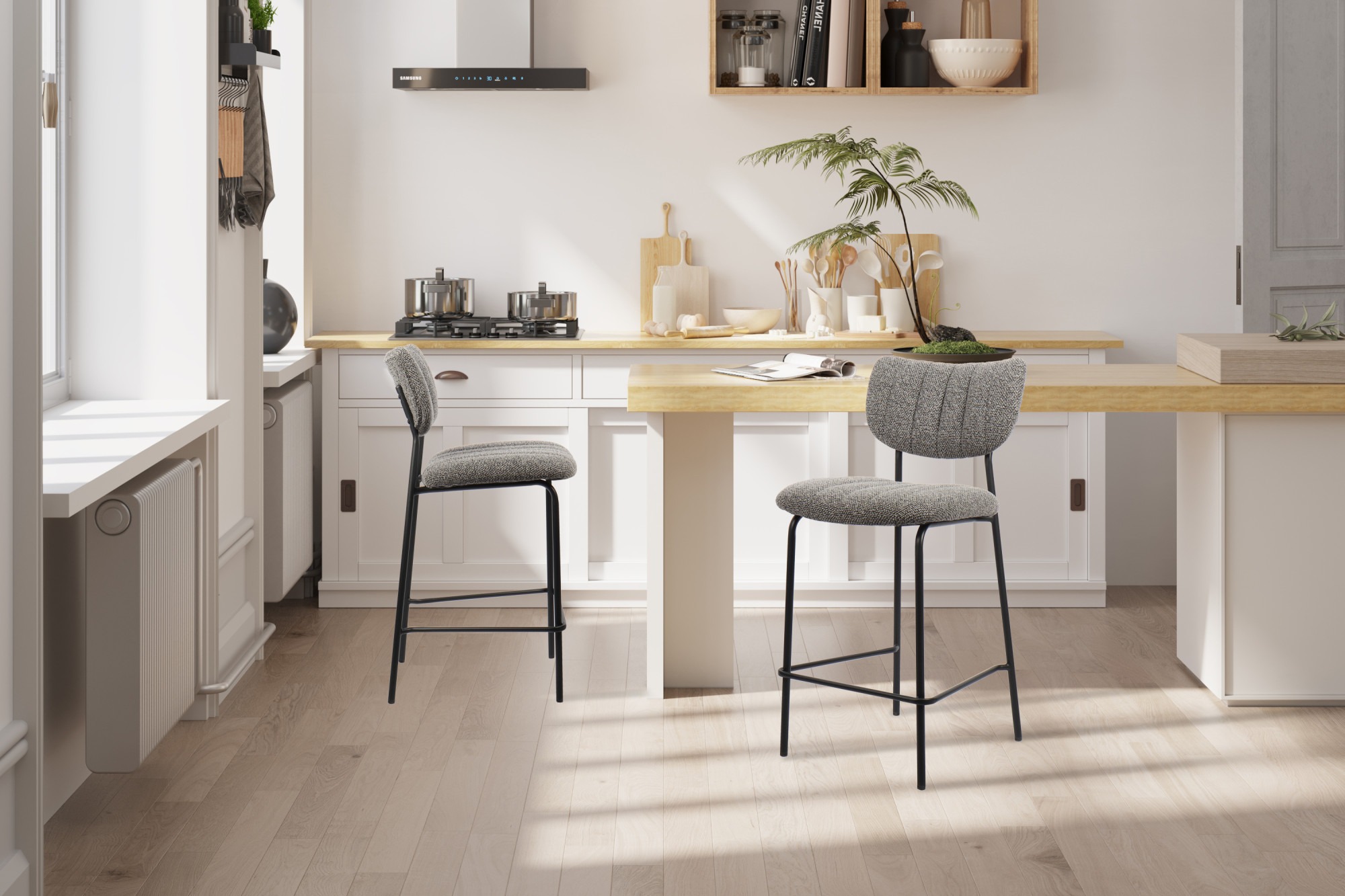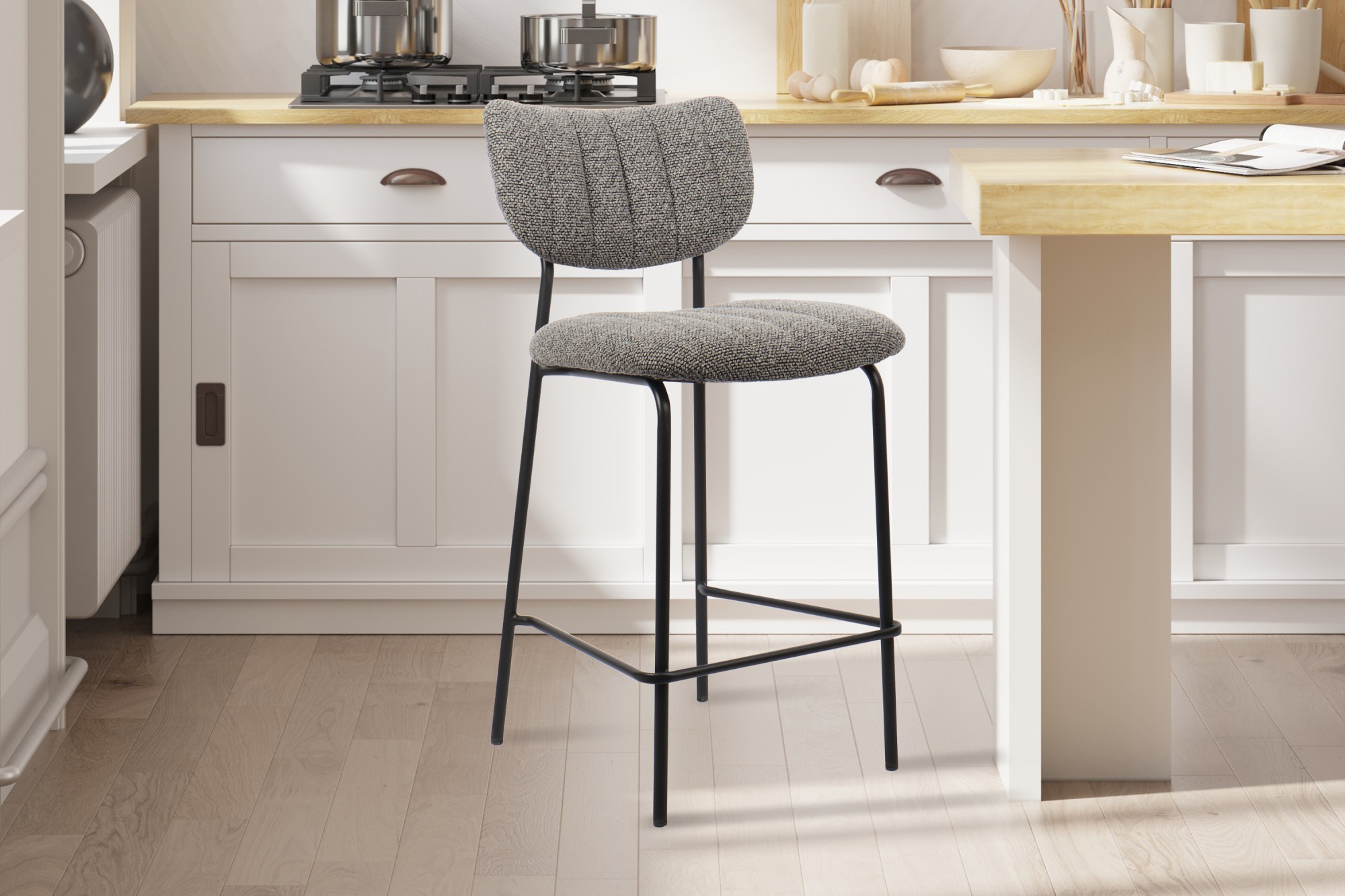 Elegante donkergrijze kruk ‘Antura’ van stof, perfect voor aan een keukeneiland of hoge tafel. Afmetingen 97 x 46 x 53 cm..