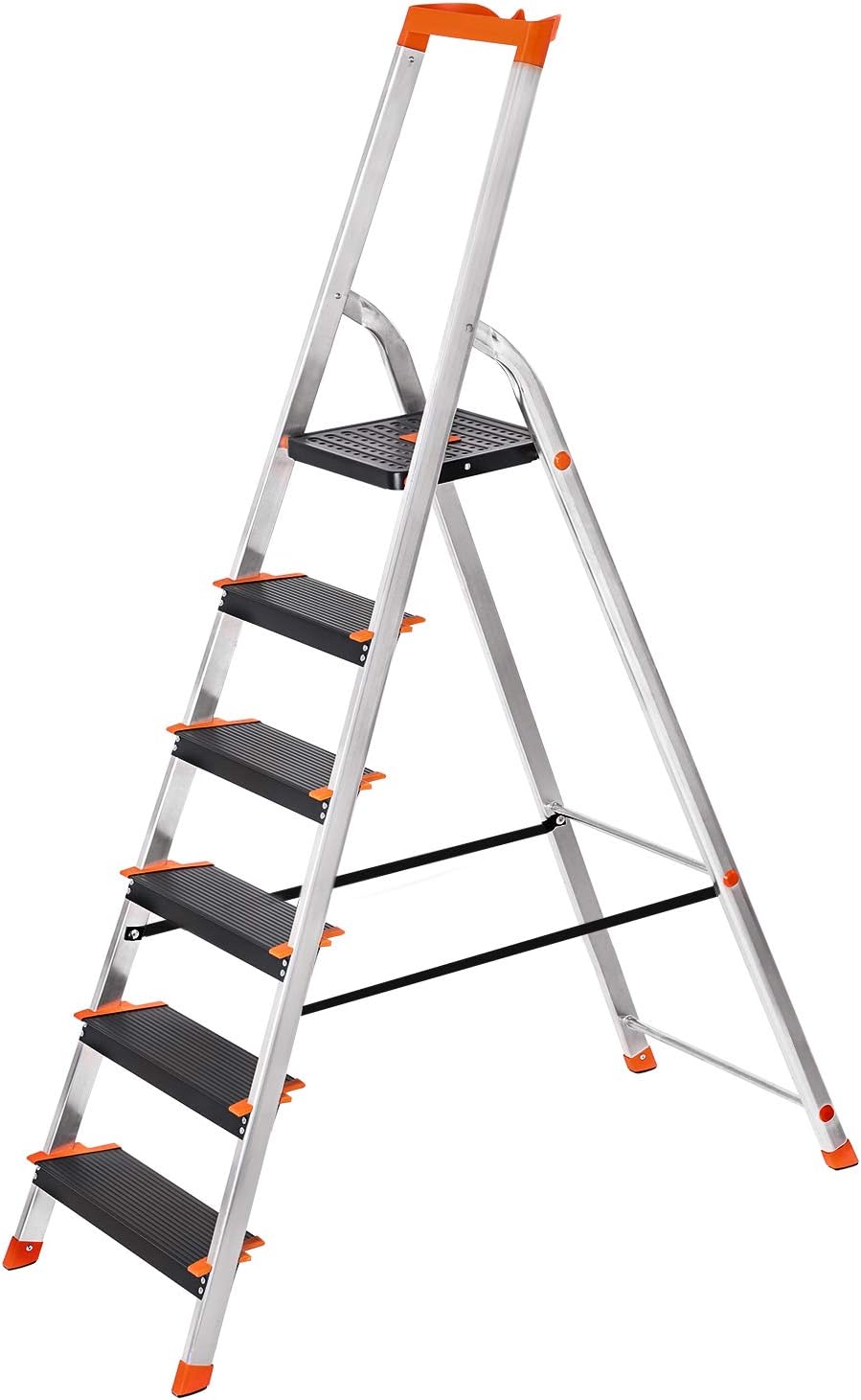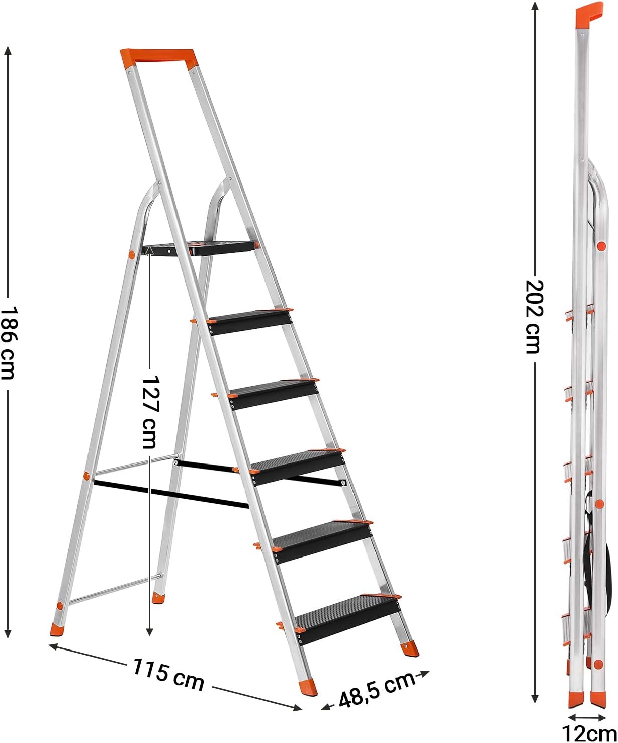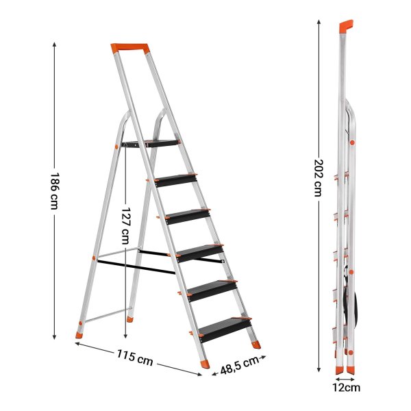 Ladder 6 treden, aluminium ladder, 12 cm brede treden, trapladder, gereedschapsbakje, vouwladder, antislip, max. statische belasting 150 kg