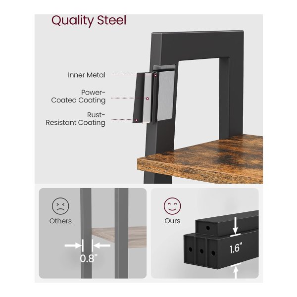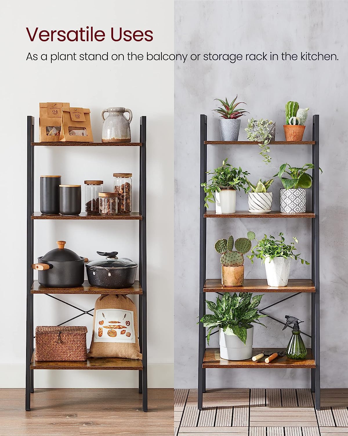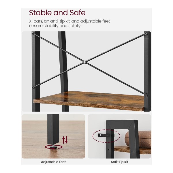 Met deze ladderplank, 4-laags boekenrek, opbergrek, boekenkast met stalen frame kunt u uw woonkamer, thuiskantoor, keuken of slaapkamer een industriƫle stijl geven. Het is verkrijgbaar in rustiek bruin en zwart, waardoor het een perfecte aanvulling is op elke ruimte.