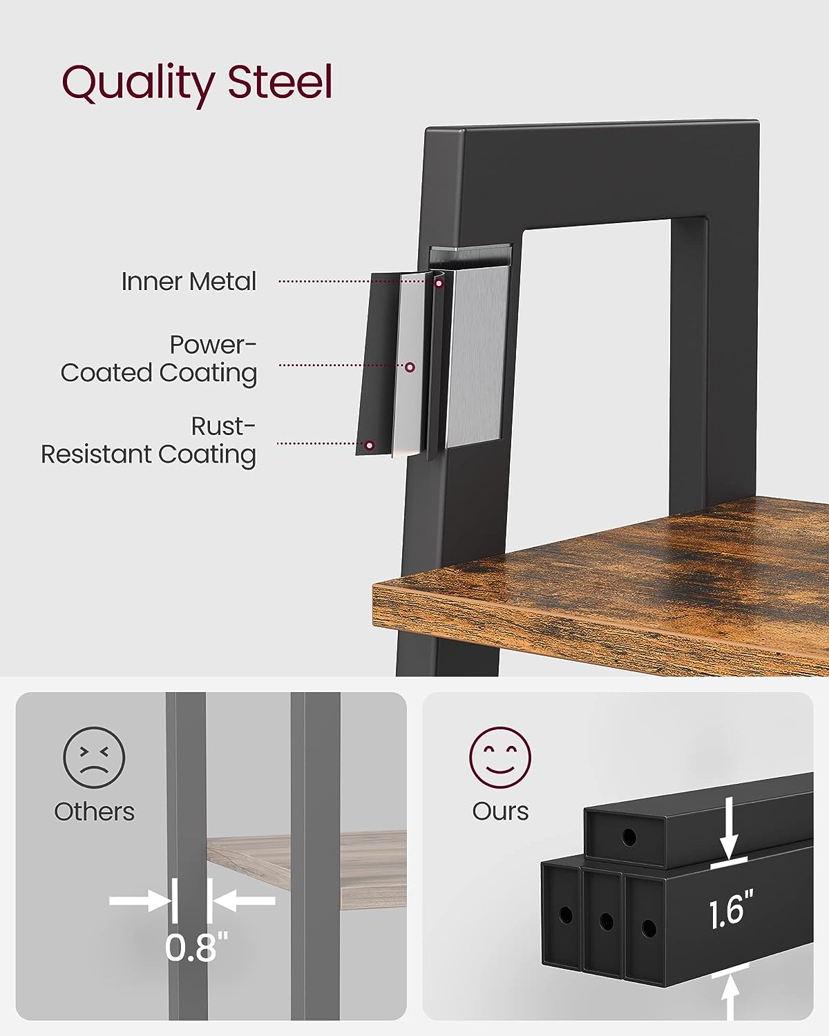 Het frame is gemaakt van stevig staal en is voorzien van een antikleeflaag om te voorkomen dat het metaal aan uw muren of meubels blijft plakken. De planken zijn gemaakt van massief hout en zijn sterk genoeg om boeken, decoratie, kunstwerken en andere items te dragen.