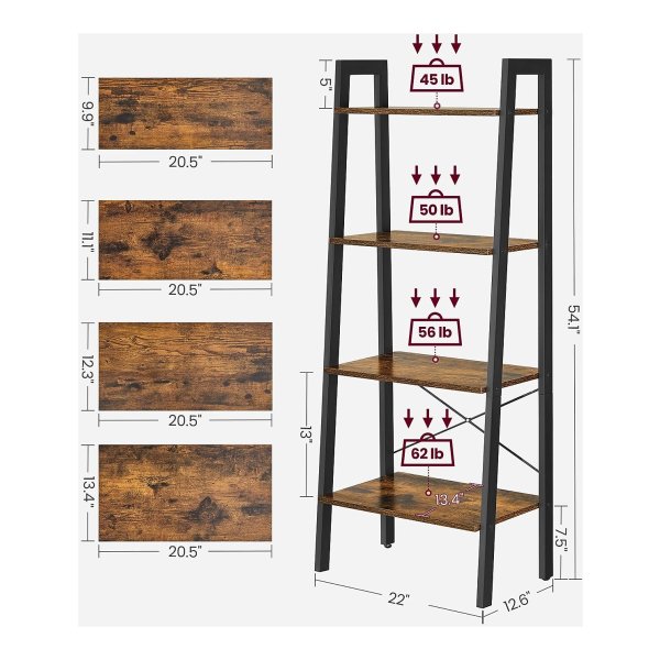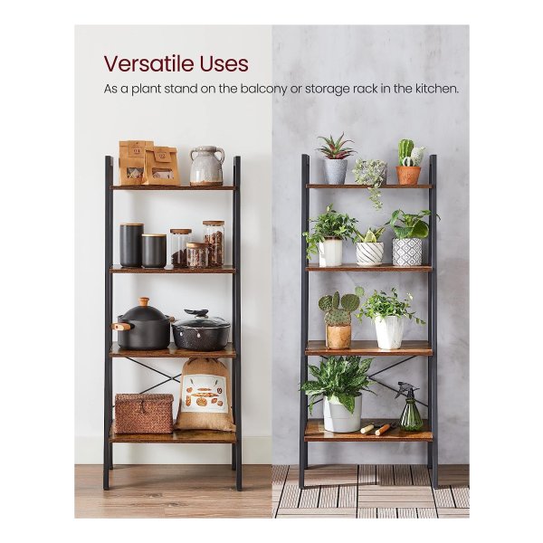 Deze ladderplank, 4-laags boekenrek, opbergrek, boekenkast met stalen frame is een perfecte toevoeging aan uw woonkamer, thuiskantoor, keuken of slaapkamer. Het heeft een industriƫle stijl en is verkrijgbaar in rustiek bruin en zwart.