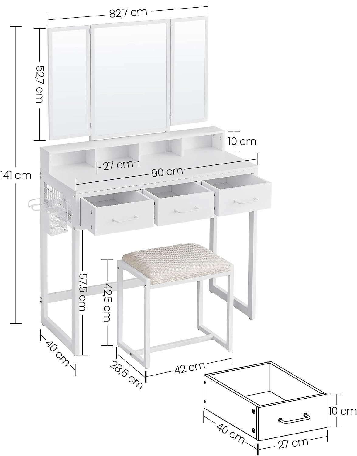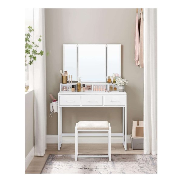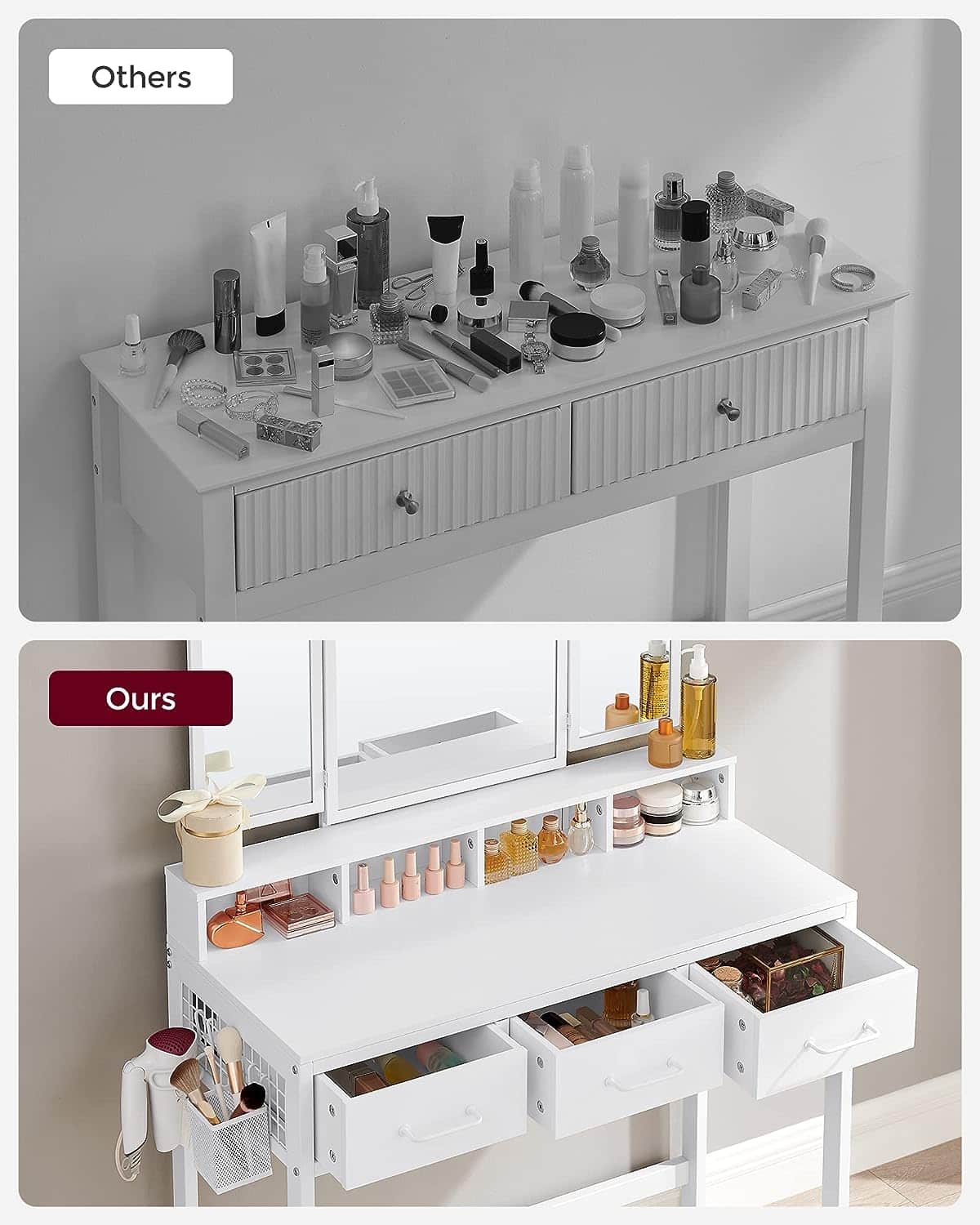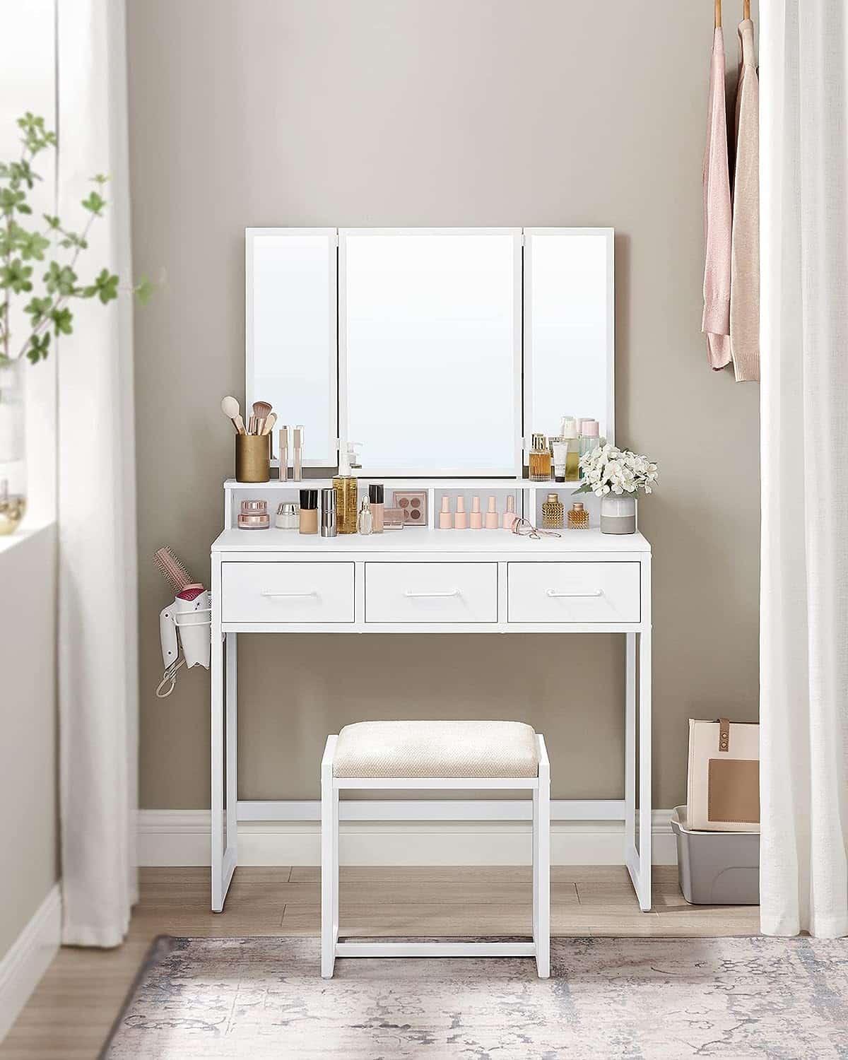 Make -uptafel met gestoffeerde, kaptafel met drievoudige spiegel, 3 laden, haardrogerhouder, cosmetische tafel, moderne stijl, wit, RVT004W14