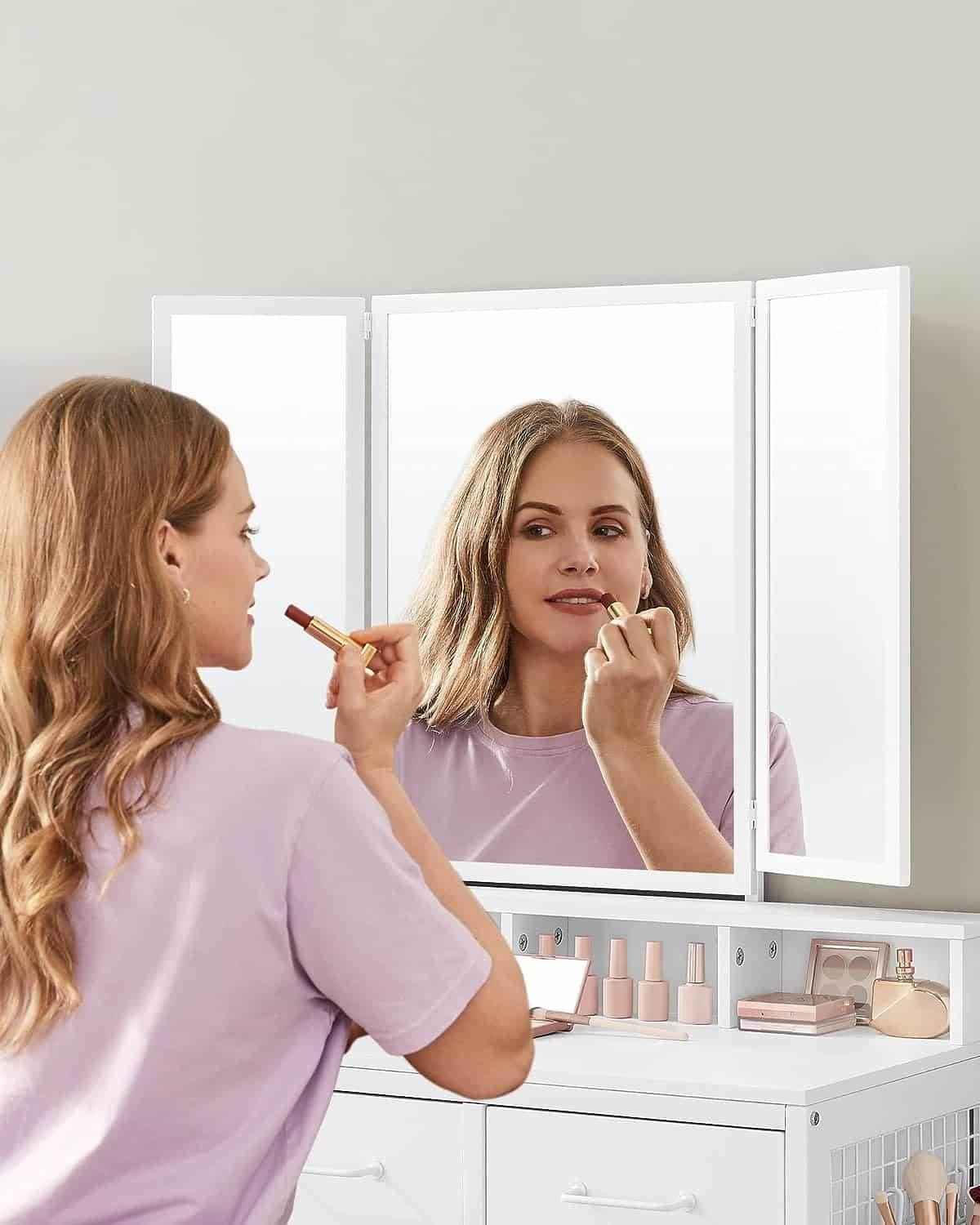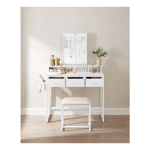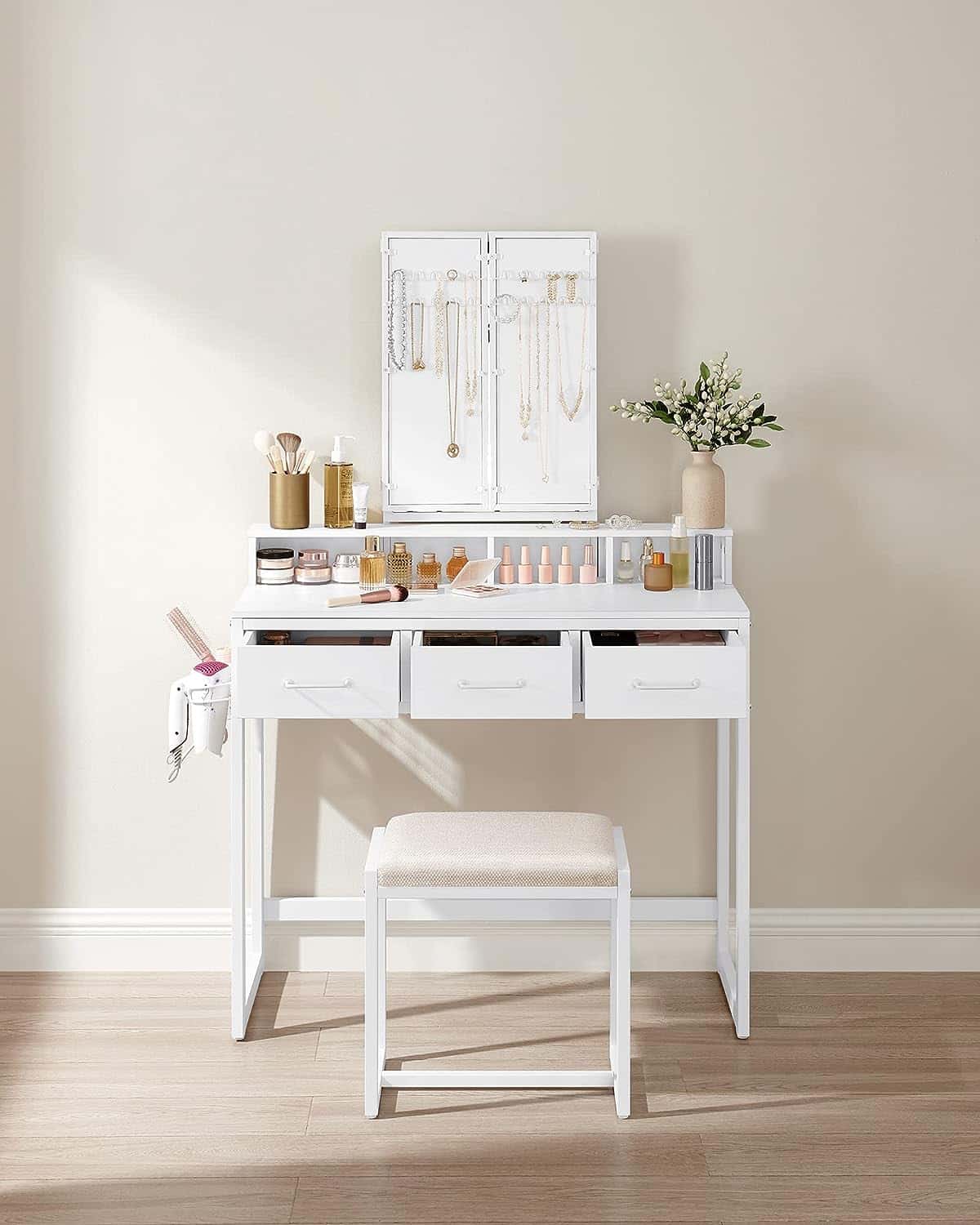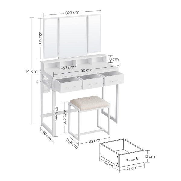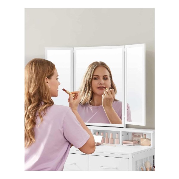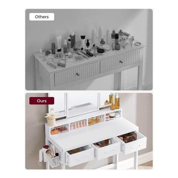 Make -uptafel met gestoffeerde, kaptafel met drievoudige spiegel, 3 laden, haardrogerhouder, cosmetische tafel, moderne stijl, wit, RVT004W14