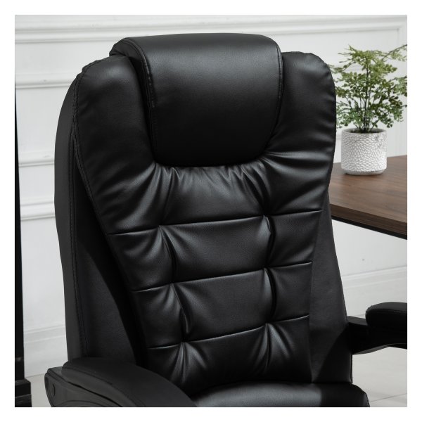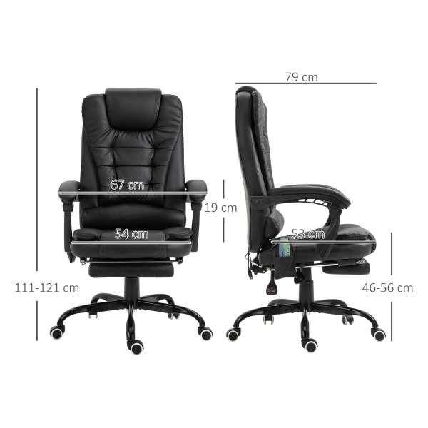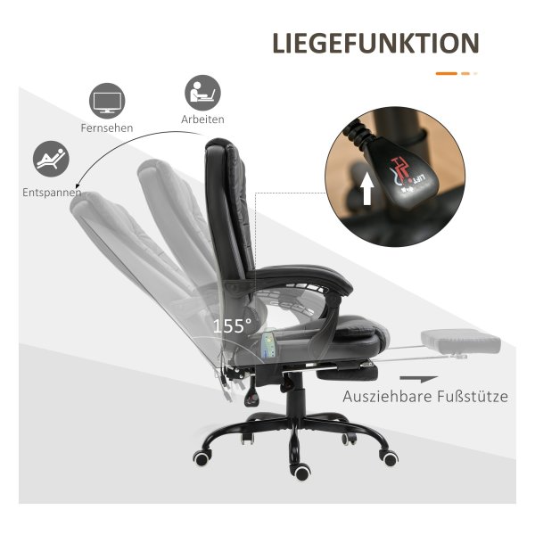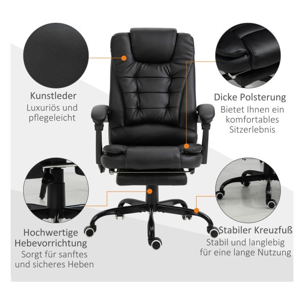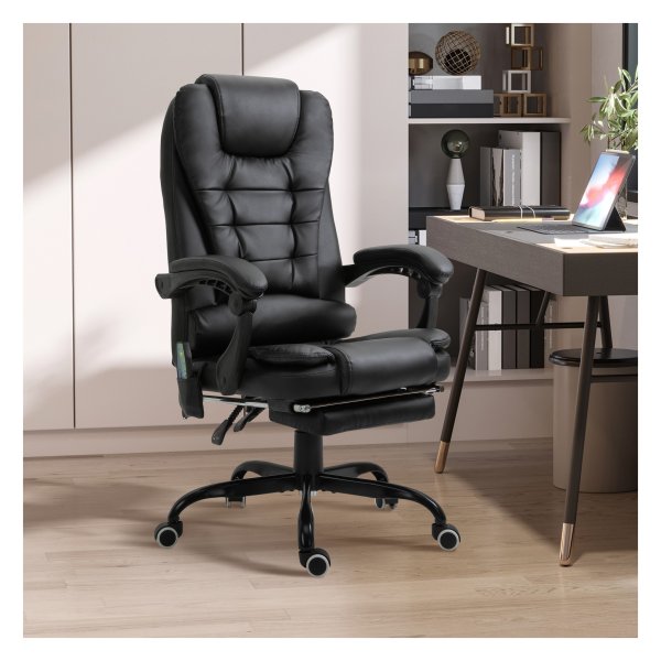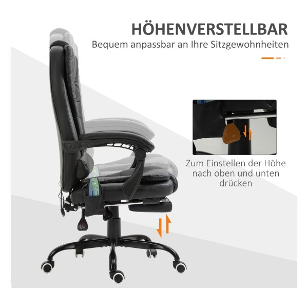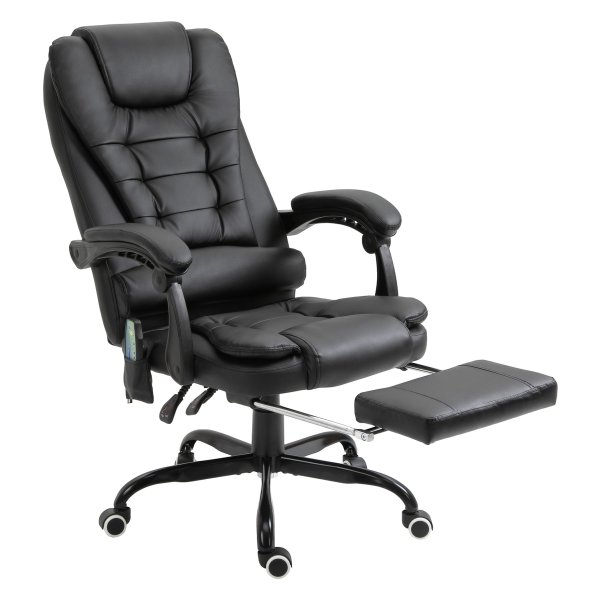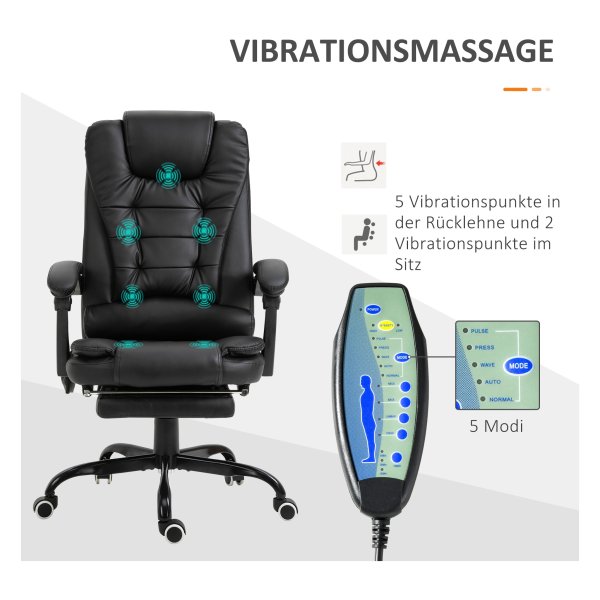 Bullet Point 2 | Dit bureaustoelontwerp van Vinsetto biedt een combinatie van comfort en luxe met een 7-punts massagefunctie, verstelbare rugleuning, inklapbare voetensteun en gentegreerd lendenkussen. De stoel is 360 draaibaar en in hoogte verstelbaar voor maximale mobiliteit op kantoor. Het zwarte kunstleren ontwerp is CE-EMC, RoHS, LVD en ERP-gecertificeerd en wordt geleverd met afstandsbediening en montagehandleiding voor eenvoudige montage. |