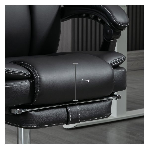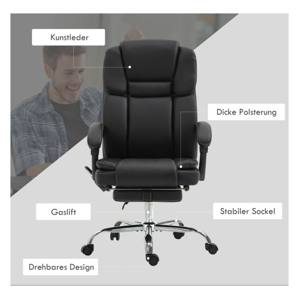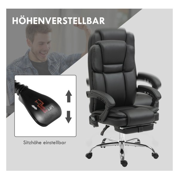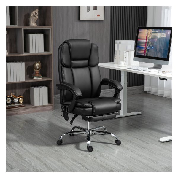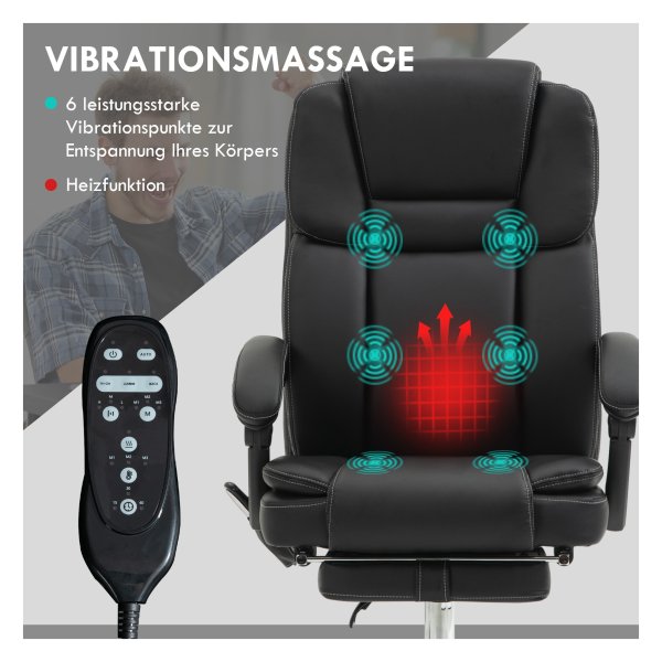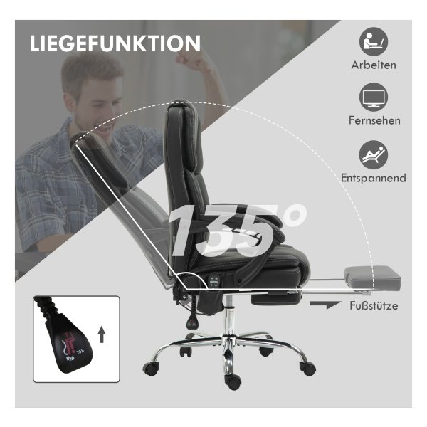 Lange (thuis)werkdagen? Deze luxe bureaustoel combineert comfortabel zitten met vibratiemassage en lendenwarmte. Leun tot 135° achterover, klap de voetsteun uit en ontspan terwijl je productief blijft.