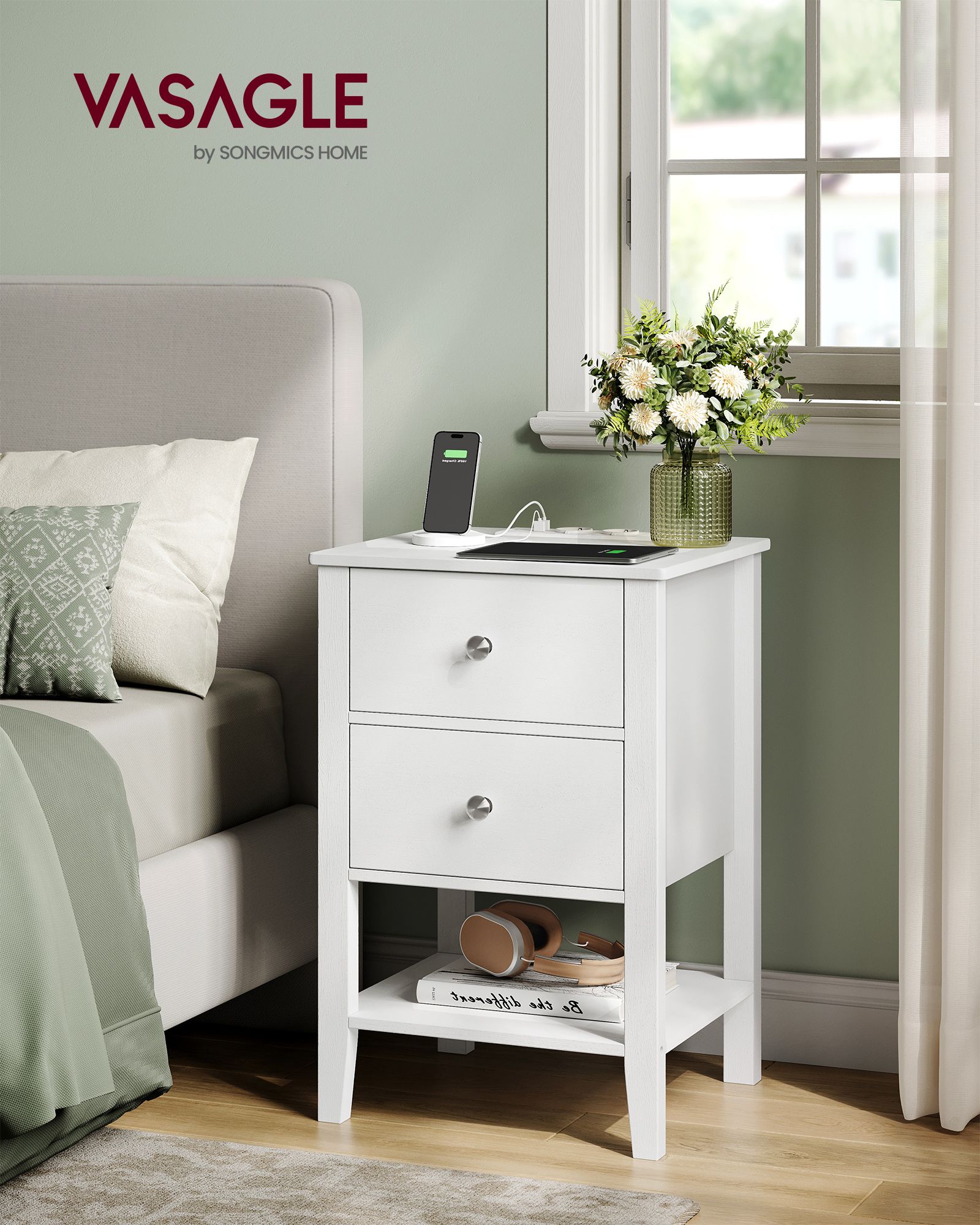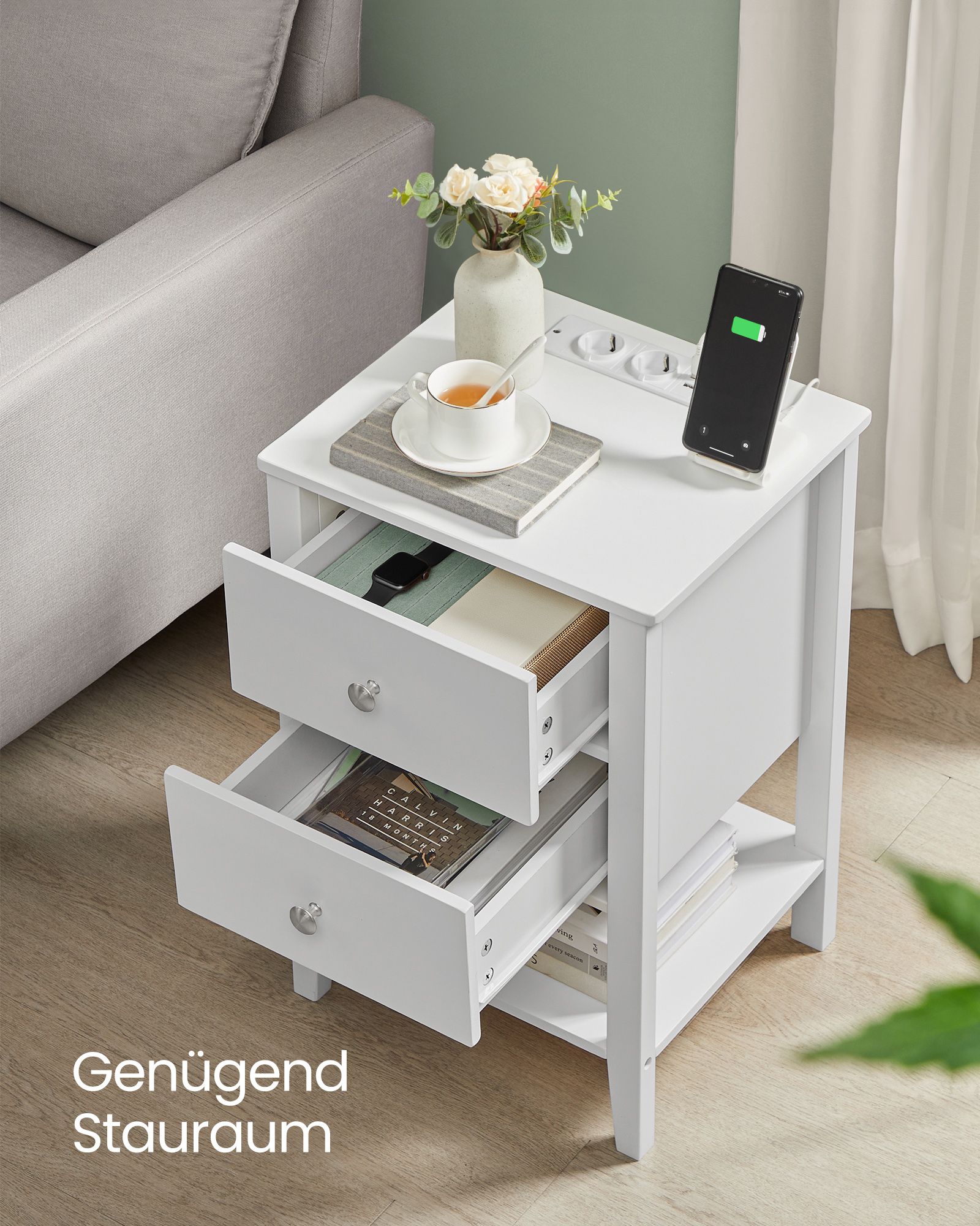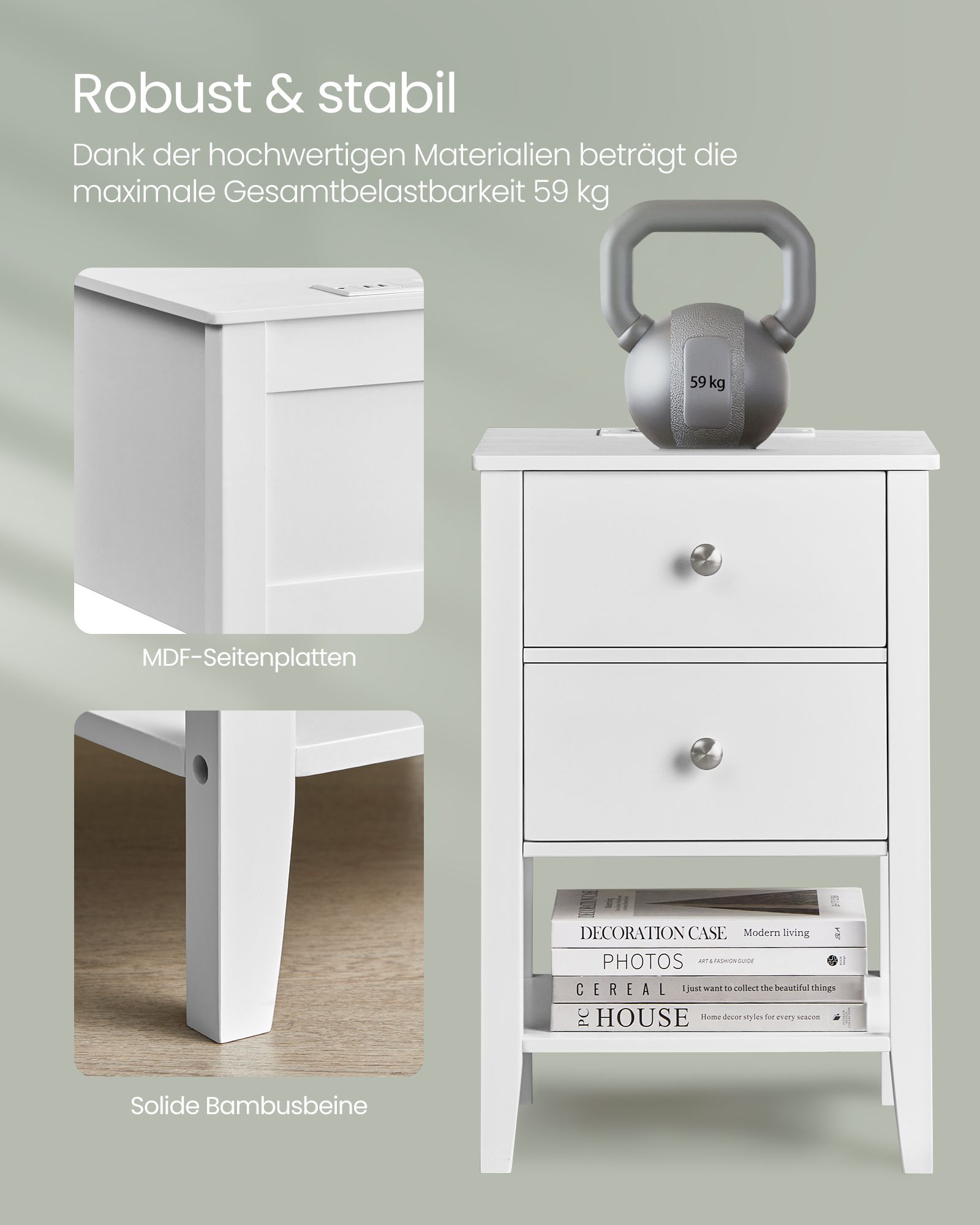 Een robuust nachtkastje van bamboe met veel opbergruimte en handige oplaadmogelijkheden. Minimalistisch design in helder wit, perfect voor elke kamer. Eenvoudig te monteren en schoon te maken, ideaal voor ordelijke en stijlvolle opbergruimte.