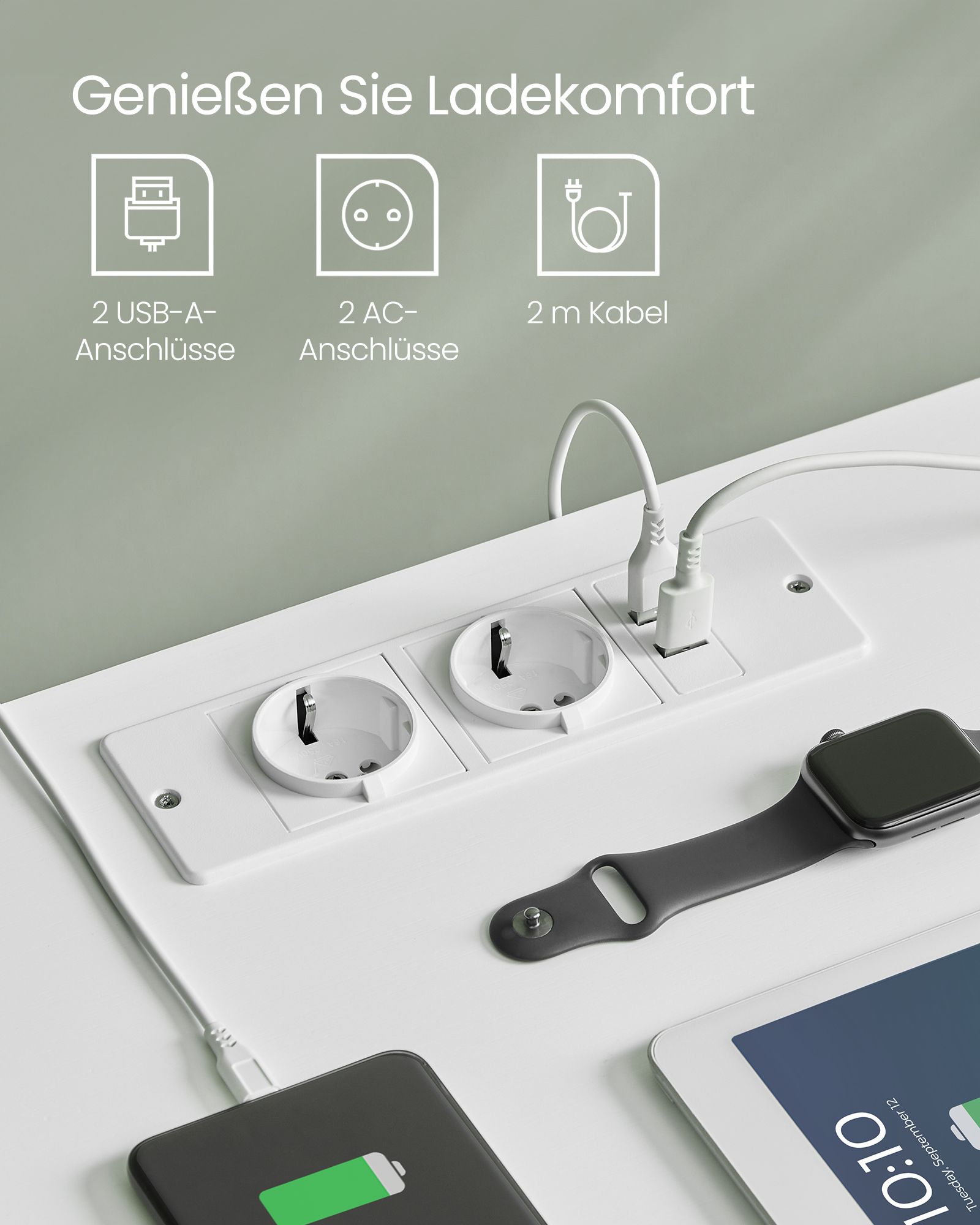 Met 2 stopcontacten en 2 USB-A poorten is het opladen van meerdere apparaten in bed of op de bank nog nooit zo eenvoudig geweest. Geen gedoe meer met ontoegankelijke stopcontacten of in de knoop geraakte kabels.