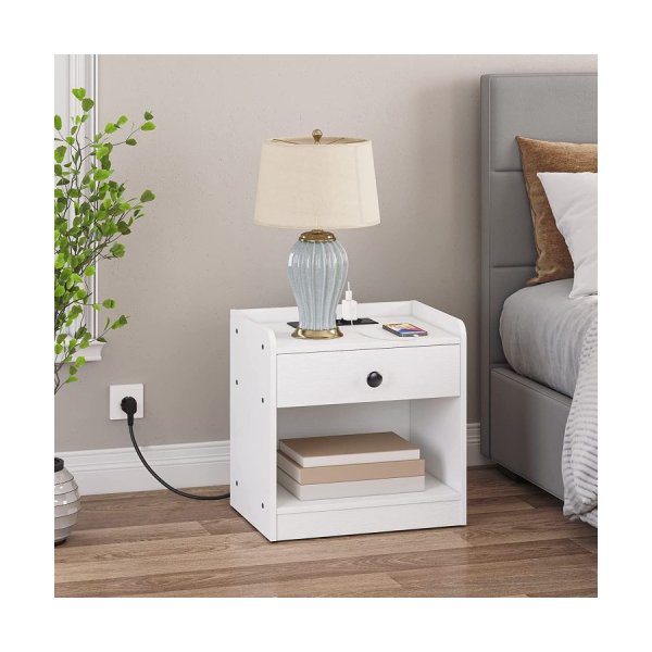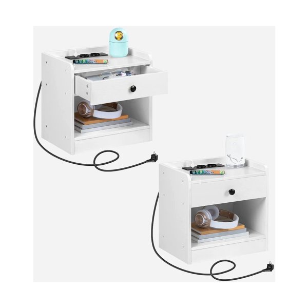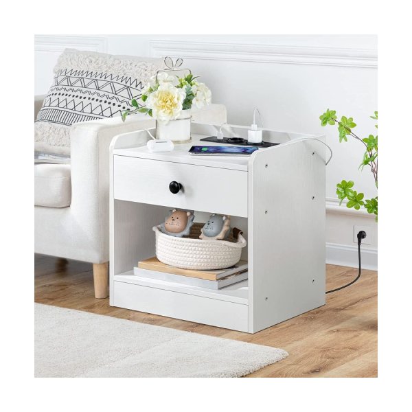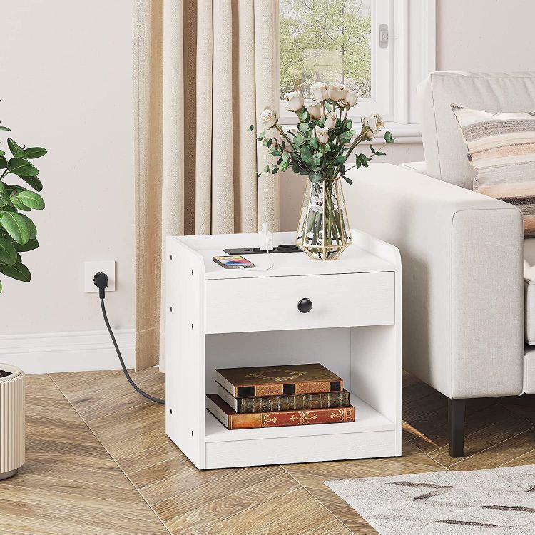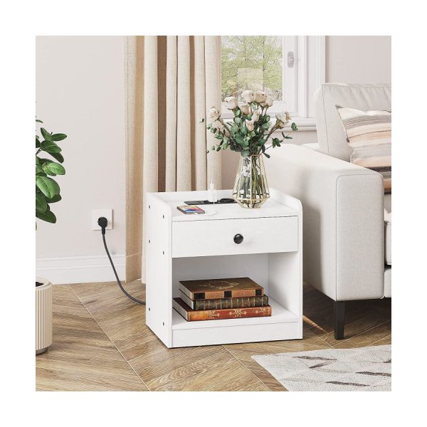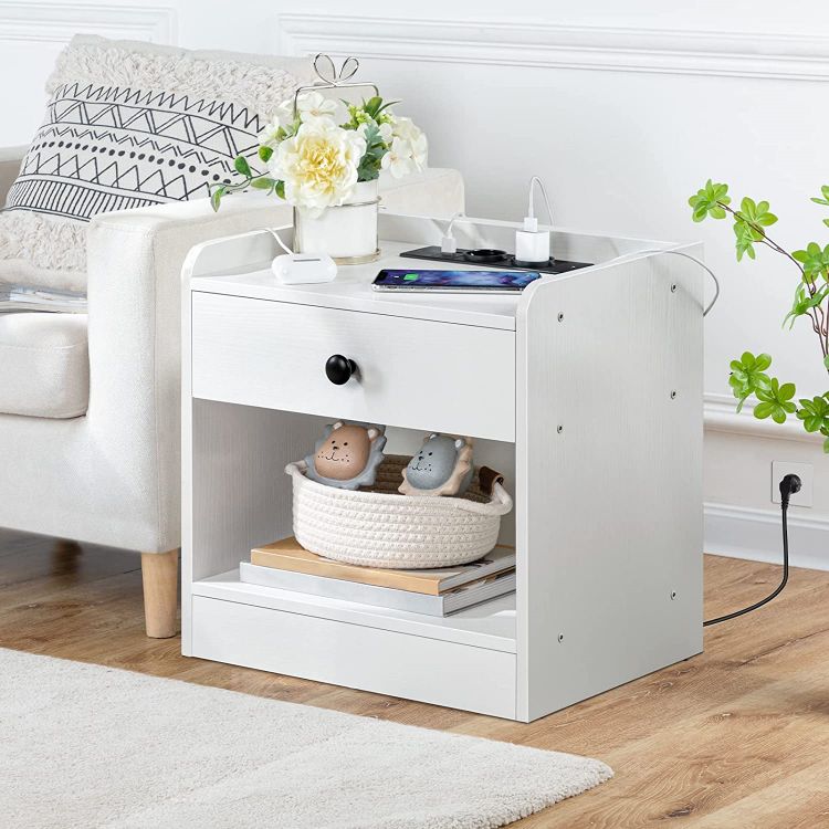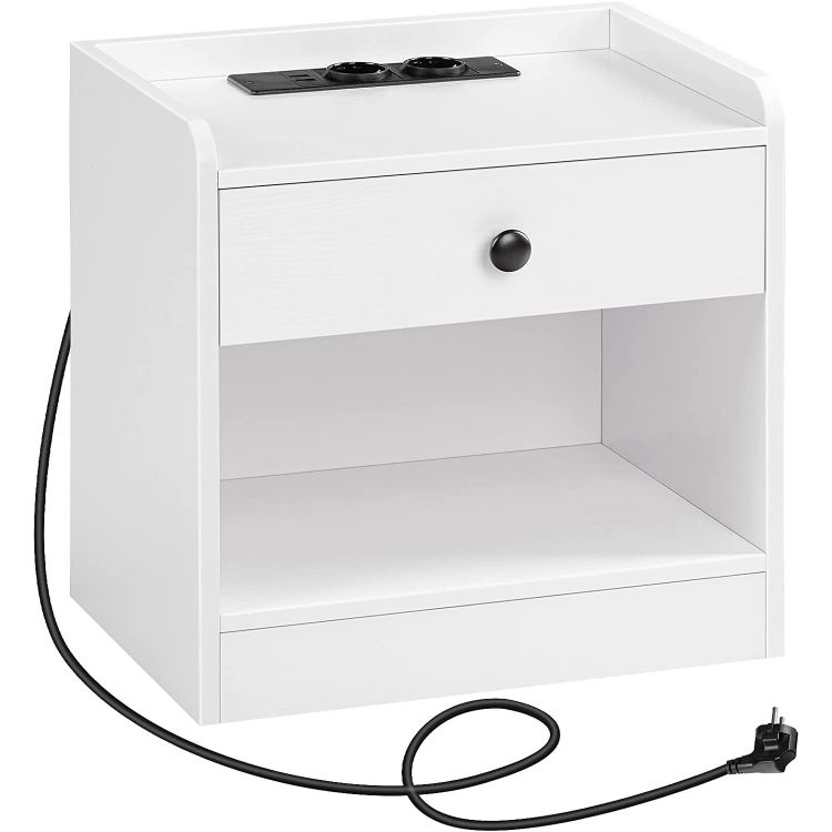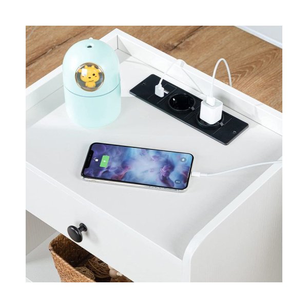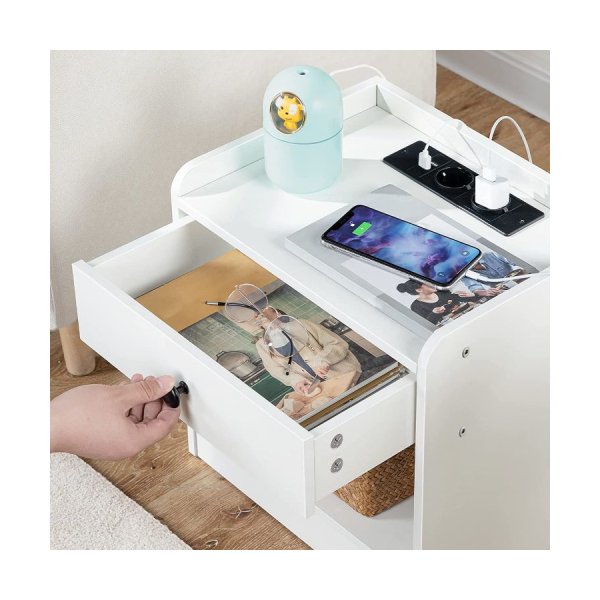 Nachtkastje met oplaadstation, bijzettafel met lade en open compartimenten, USB -poorten en sockets, opbergplank, bijzettafel voor slaapkamer, woonkamer, witte