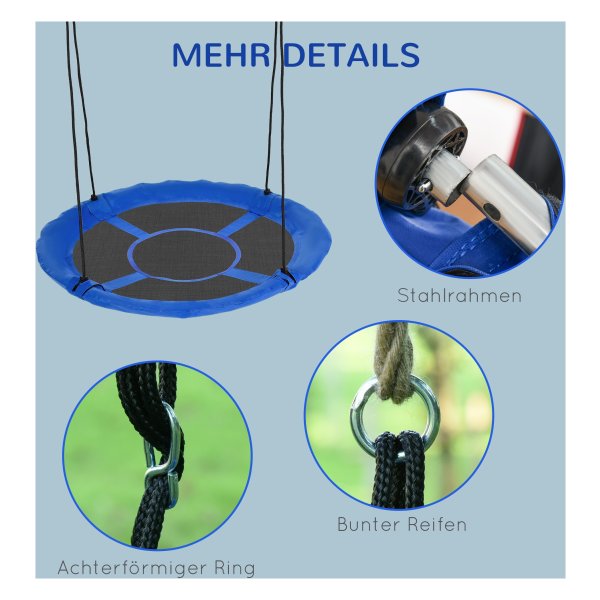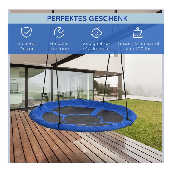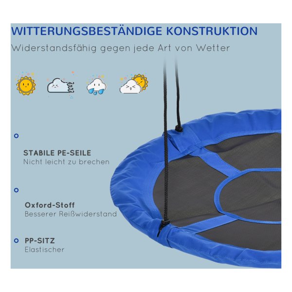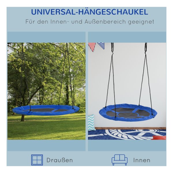 De hangschommel wordt geleverd met twee sterke en verstelbare touwen, waardoor het makkelijk is om hem aan een bestaande schommel of aan een boom te bevestigen. Het stevige stalen frame en de elastische kunststof hoes zorgen voor stabiliteit en duurzaamheid, terwijl de blauwe kleur een vrolijke uitstraling geeft aan de omgeving.
