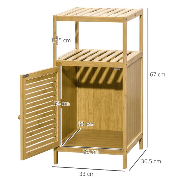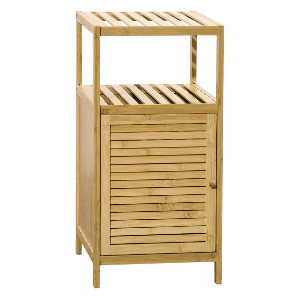 - Dankzij het moderne design en de natuurlijke bamboekleur past deze kast gemakkelijk in elke badkameromgeving.