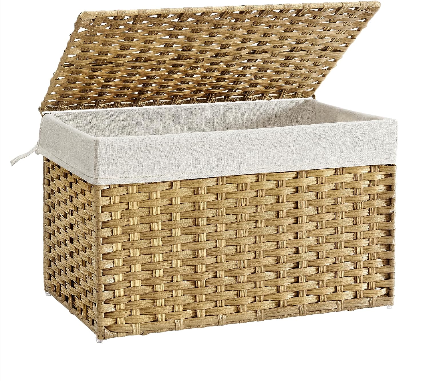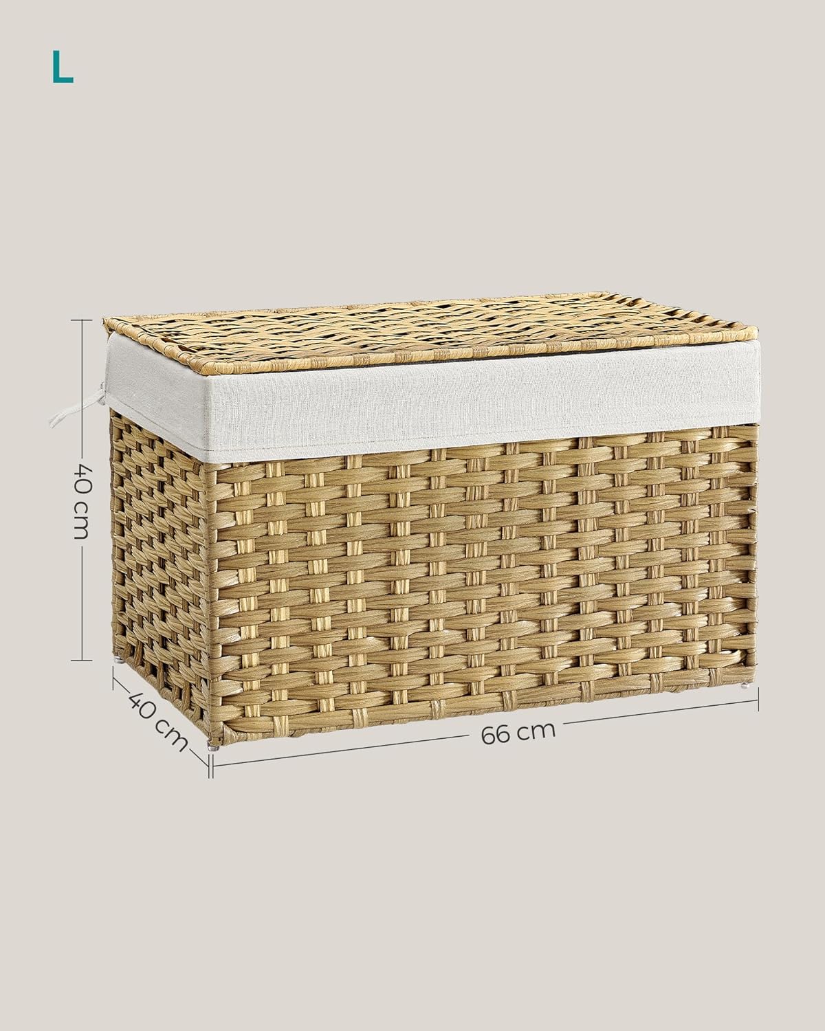 Opbergmand, 105L Vuilwasmand met Deksel, Opvouwbaar, Verwijderbare Stoffen Zakken en Handvatten, voor Dekens, Kleding, Woonkamer, Slaapkamer, Wasserij, Houten Kleur
