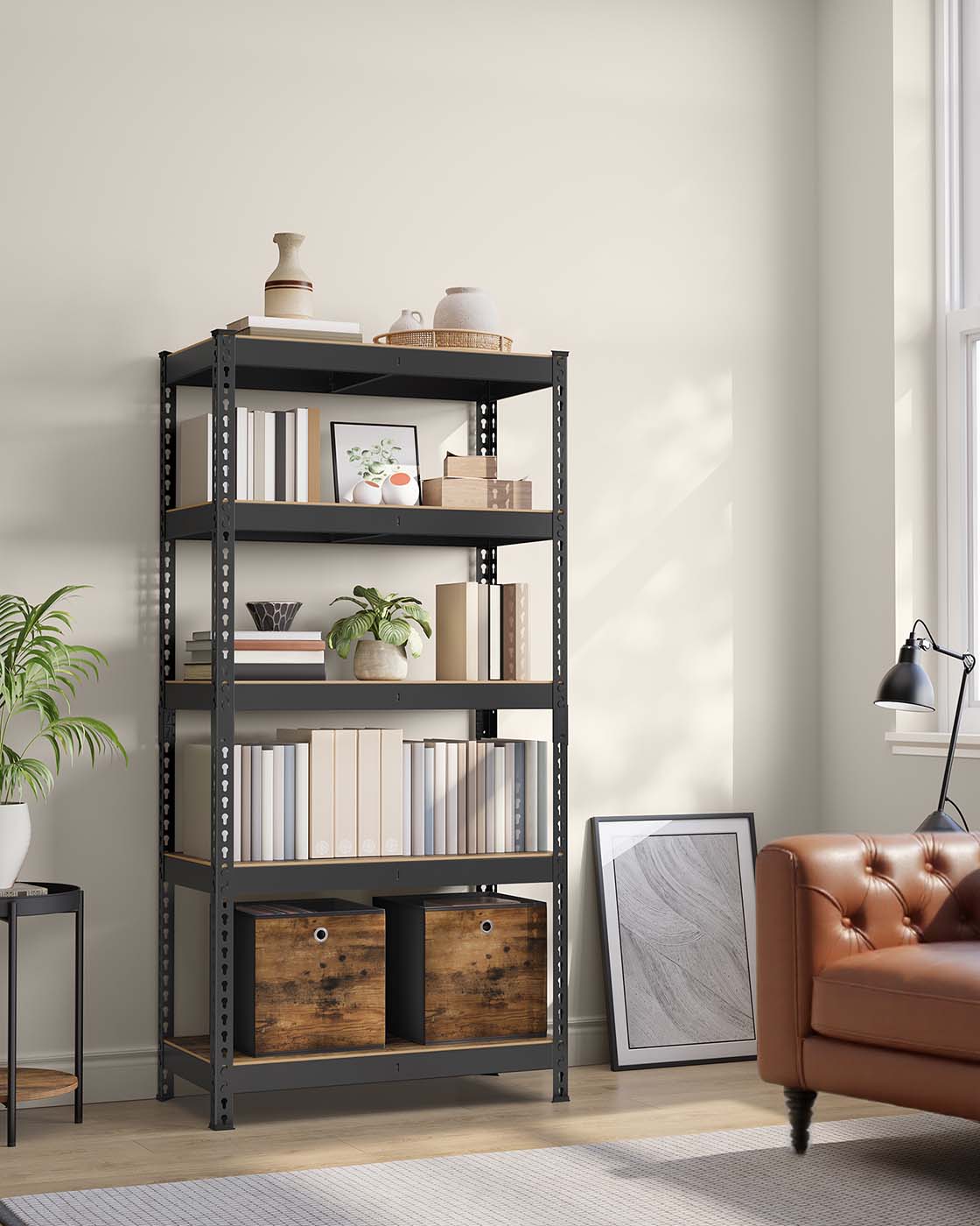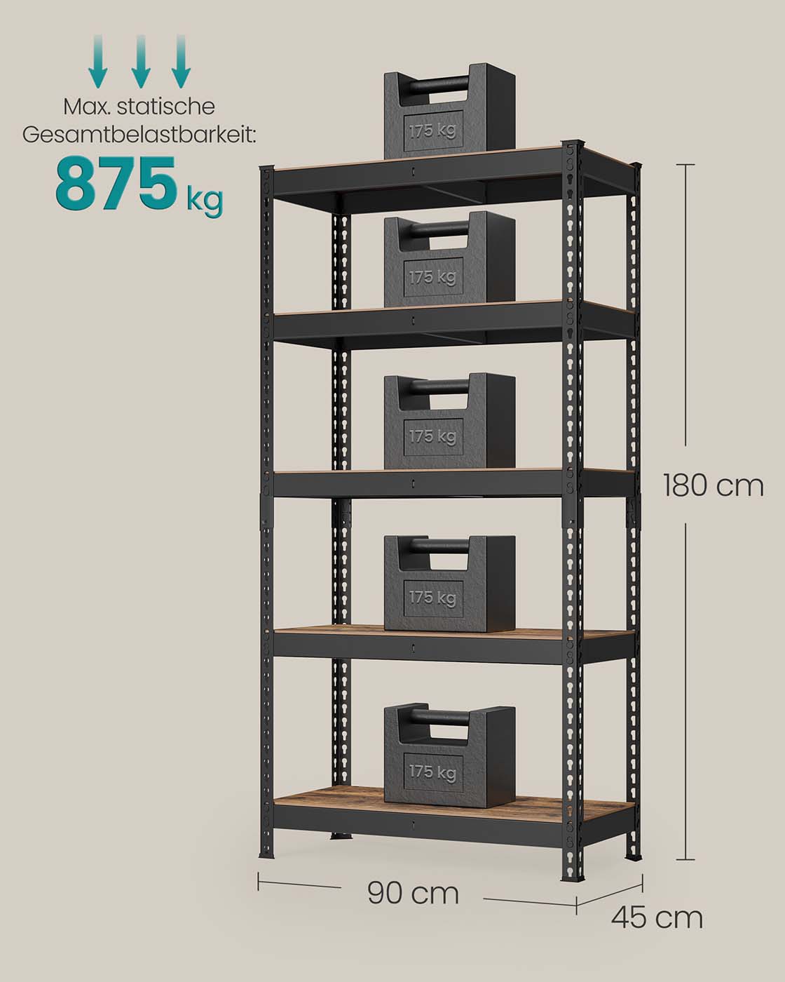Dit opbergrek in vintage bruin heeft een hoog draagvermogen van 875 kg, verstelbare planken en is eenvoudig te monteren zonder bouten. Het is ook verdeelbaar in 2 units voor meer flexibiliteit en wordt geleverd met handige extra’s voor stabiliteit en veiligheid..