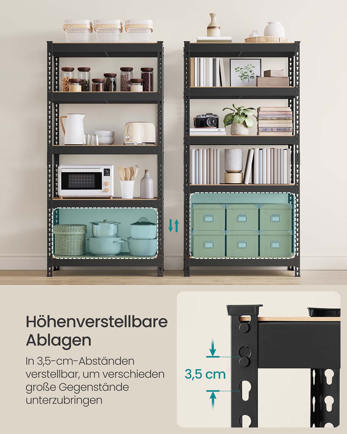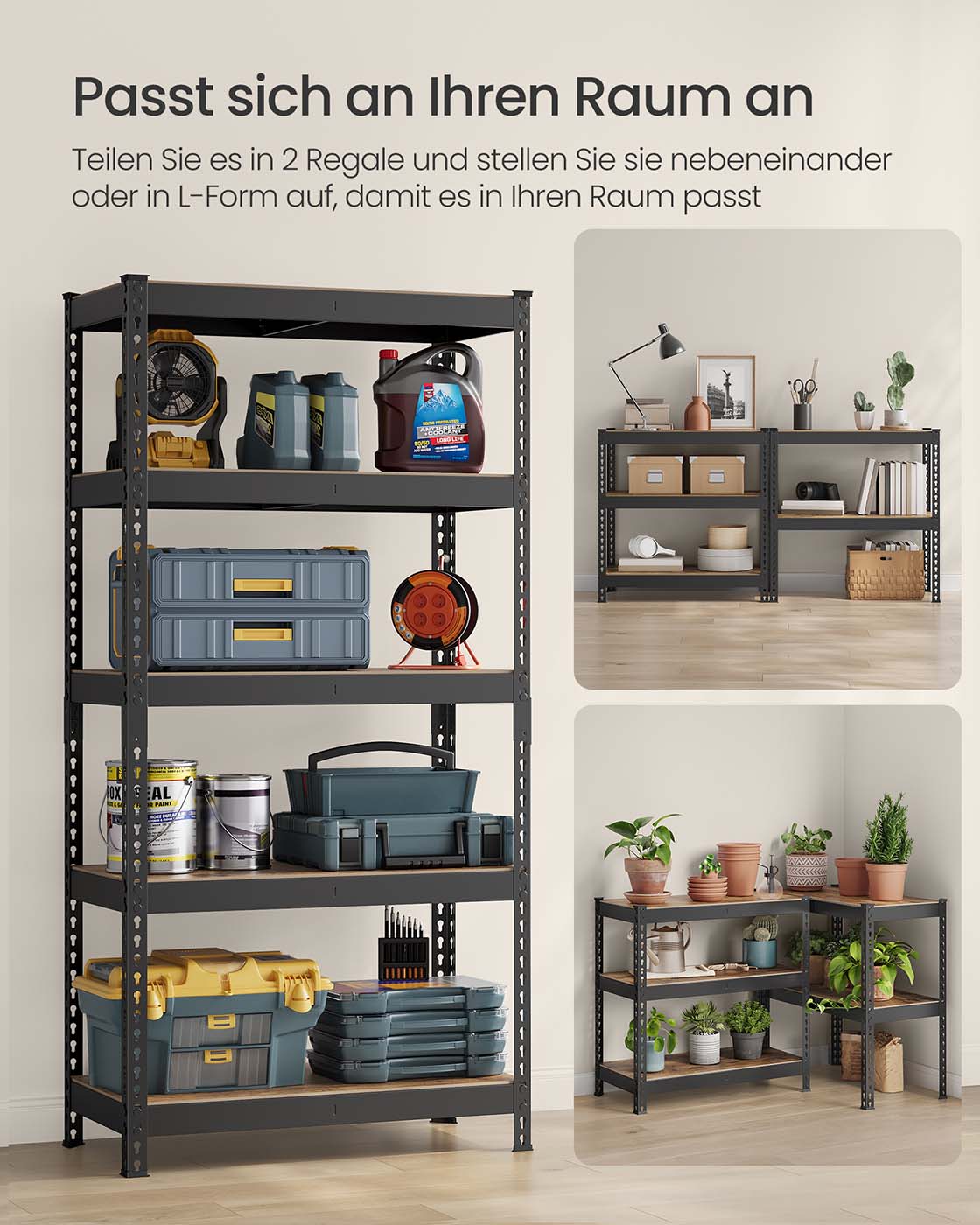 Met een statische belastbaarheid van maar liefst 500 kg is dit opbergrek in staat om al je spullen veilig en georganiseerd te houden, of het nu gaat om gereedschappen, dozen, sportuitrusting of decoratieve items. De verstelbare legplanken zorgen ervoor dat je de hoogte van elk niveau kunt aanpassen naar wens, waardoor je de ruimte optimaal kunt benutten en aanpassen aan verschillende voorwerpen.