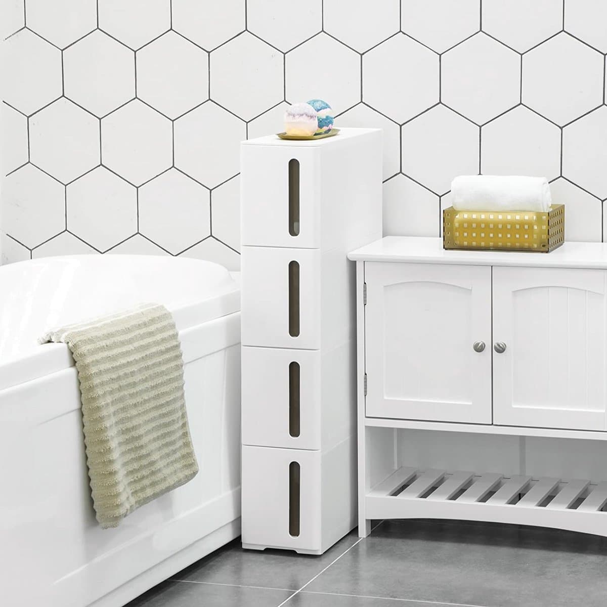 Met vier grote schuifladen biedt dit rek een inhoud van meer dan 28 liter, wat betekent dat je al je spullen georganiseerd en overzichtelijk kunt opbergen. Het kunststof materiaal waarvan dit opbergrek is gemaakt, heeft als voordeel dat schimmel en roest geen kans krijgen, waardoor het duurzaam en onderhoudsvriendelijk is.