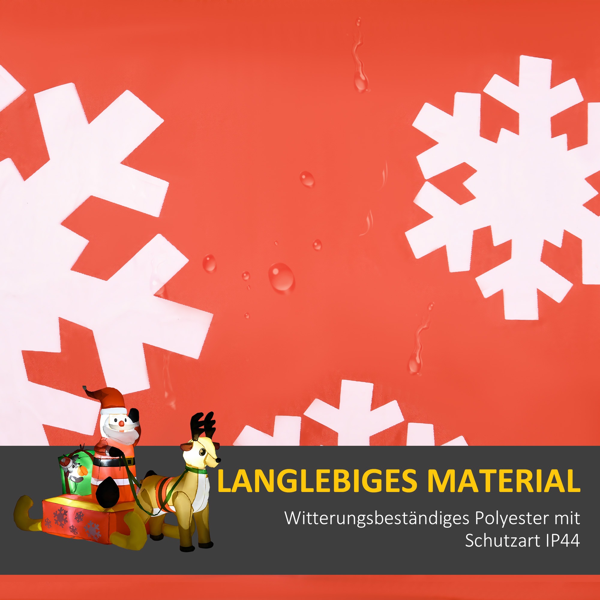 Opblaasbare kerstman op slee met rendier in rood polyester. Met 8 LED-lampen voor een warme gloed. Snel opblazen en gemakkelijk op te bergen.
