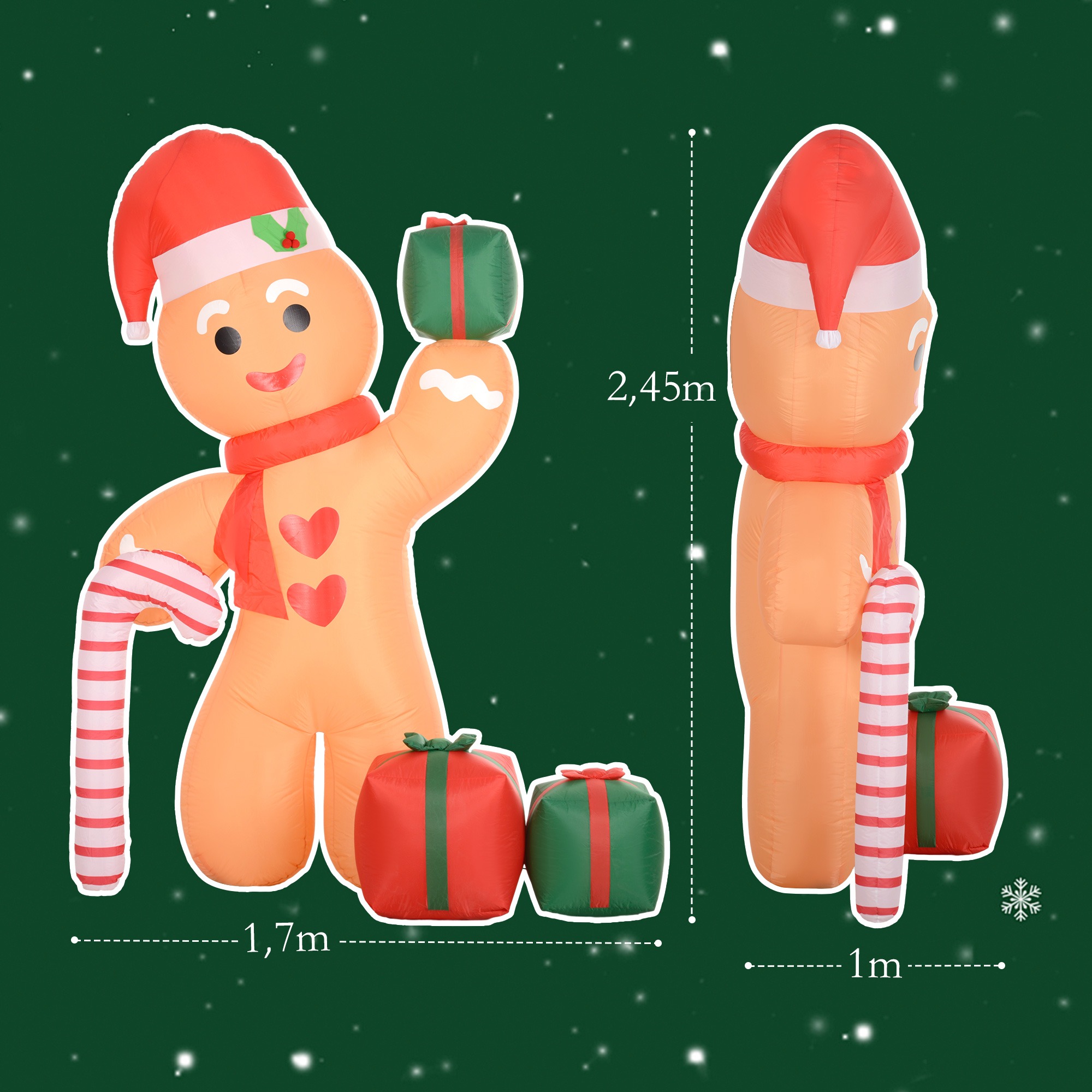 Breng de winterse sfeer tot leven met de opblaasbare peperkoekman en zuurstok, inclusief LED-verlichting. Geschikt voor gebruik buitenshuis met accessoires voor stabiliteit. Met een afmeting van 170 x 100 x 245 cm en eenvoudige opblaasfunctie.