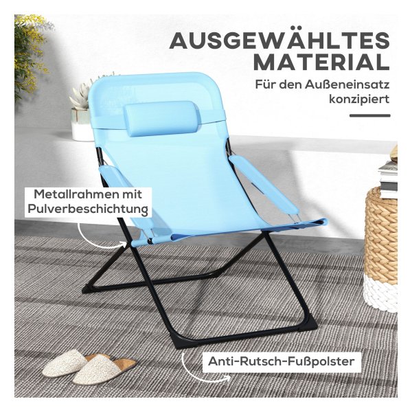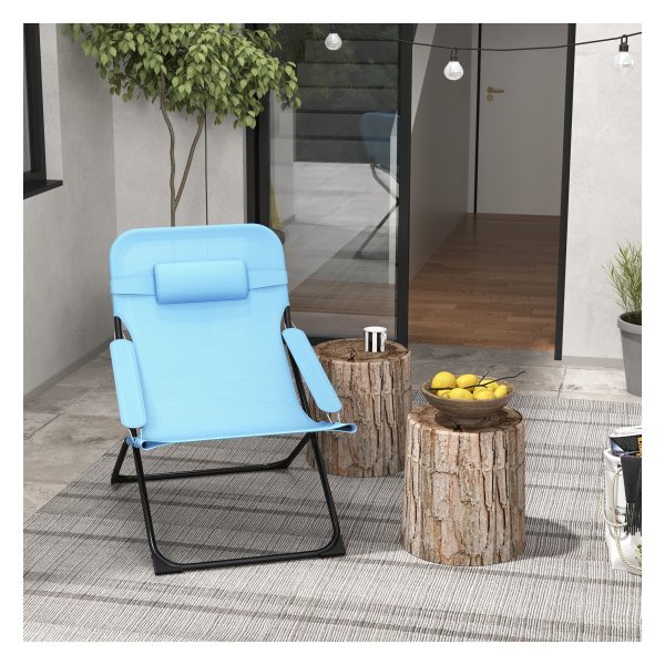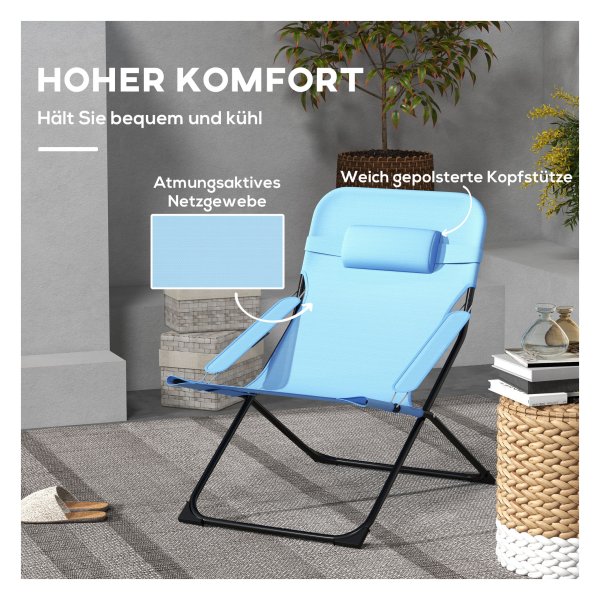 Bullet Point 1 | Het slimme ontwerp van de opvouwbare tuinstoel van Outsunny zorgt voor ultiem comfort en goede ondersteuning, dankzij de hoge rugleuning, gladde armleuningen en zacht gevoerde hoofdsteun, ideaal voor ontspannen momenten in de buitenlucht op diverse locaties. |