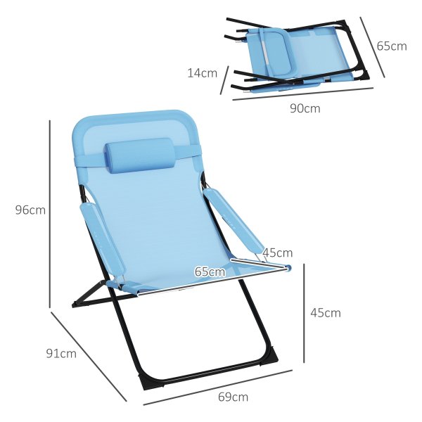 Bullet Point 4 | De montage van de opvouwbare tuinstoel van Outsunny is eenvoudig en het product biedt flexibiliteit doordat het perfect is voor verschillende locaties, zoals de tuin, het terras, bij het zwembad, tijdens het kamperen of vissen. Dankzij het opvouwbare en lichte ontwerp is de stoel makkelijk mee te nemen. De stoel heeft een verstelbare rugleuning voor extra comfort en een zacht gevoerde hoofdsteun voor ondersteuning van hoofd en nek. Daarnaast is de stoel voorzien van sneldrogende ademende stof, waardoor het ook geschikt is voor regenachtige dagen. Het stalen frame met poedercoating kan tot 120 kg dragen. De afmetingen en technische gegevens van de stoel zijn als volgt: – Kleur: Blauw – Materiaal: Staal, polyester, schuim – Totale afmetingen: 69L x 91B x 96H cm – Opgevouwen afmetingen: 90L x 65B x 14H cm – Zitafmetingen: 65B x 45D cm – Zithoogte: 45 cm – Afmetingen rugleuning: 51L x 65H cm – Afmetingen armleuning: 8,5B x 52D cm – Afmetingen hoofdsteun: 32L x 13,5B cm – Draagvermogen: 120 kg. De verpakking bevat 1 opvouwbare stoel en 1 handleiding. |
