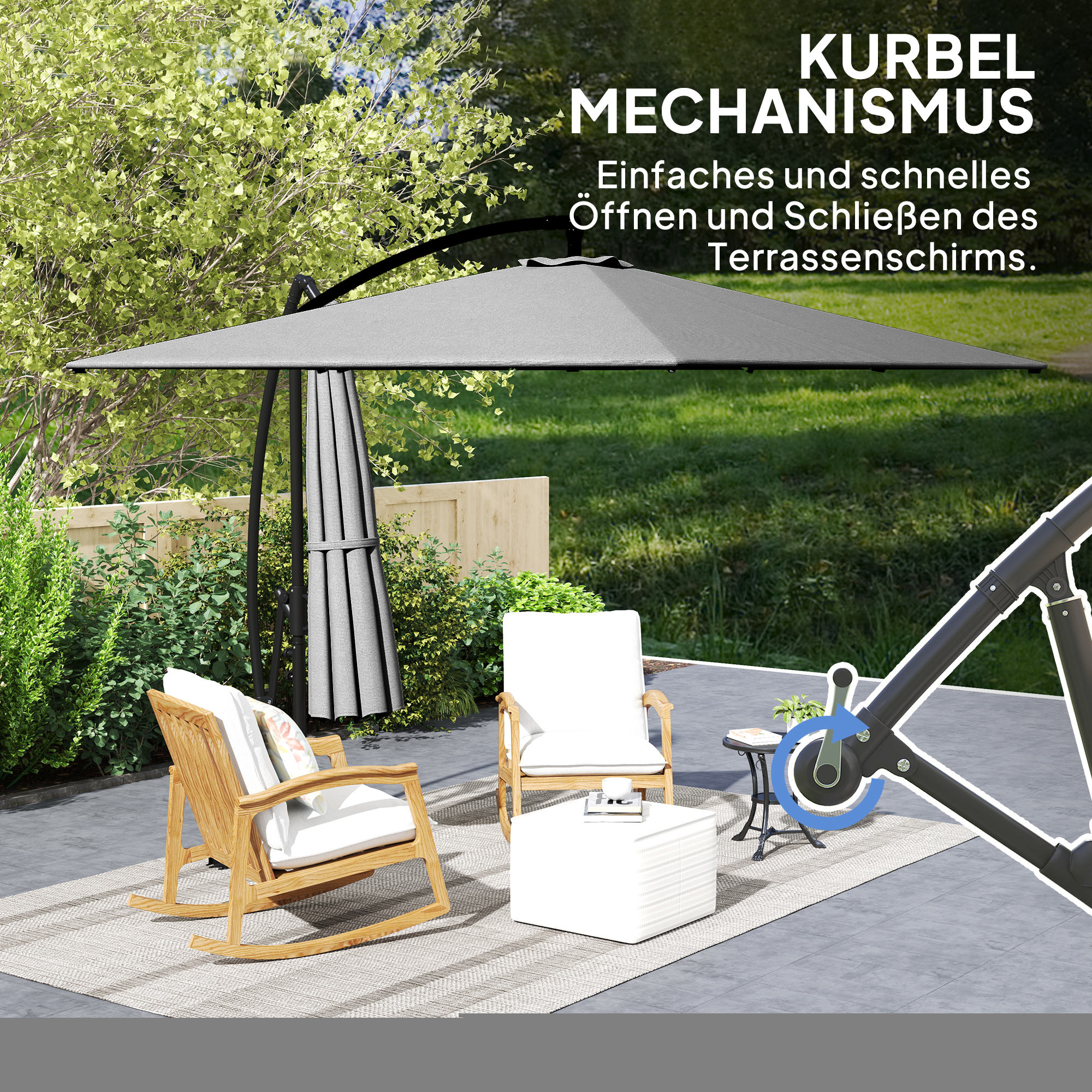 Met kantelfunctie en 360° rotatie kunt u de parasol eenvoudig aanpassen aan de stand van de zon, zodat u altijd in de schaduw kunt zitten. De soepele kurbel maakt het moeiteloos aanpassen van hoogte en hoek mogelijk, waardoor het gebruiksgemak wordt vergroot.