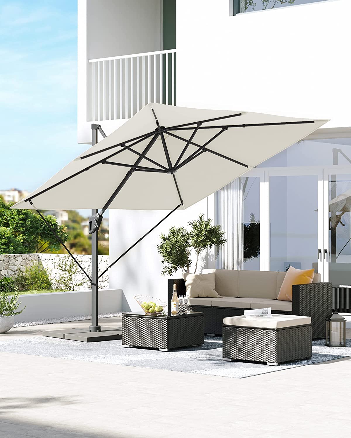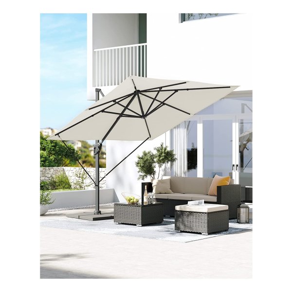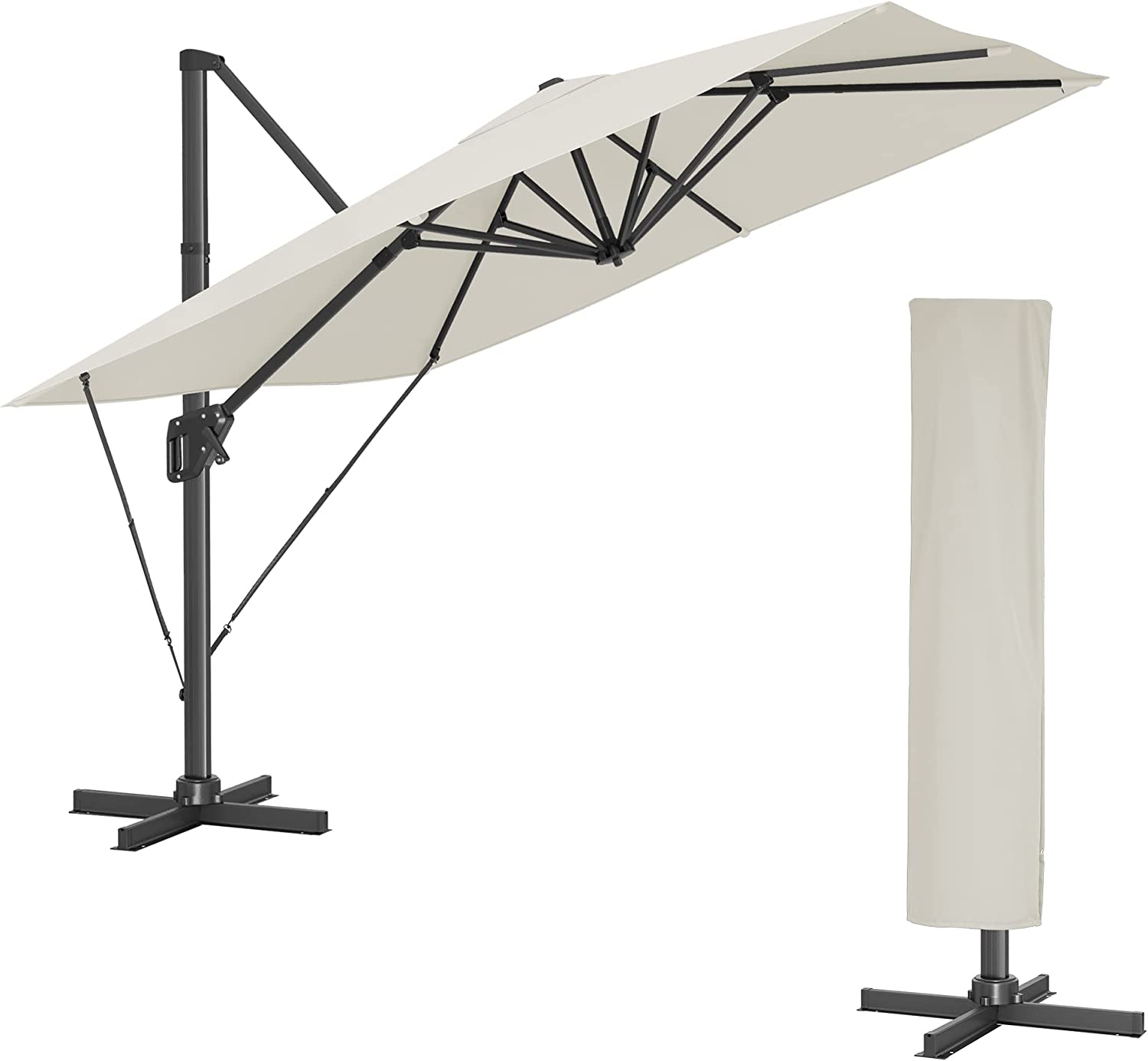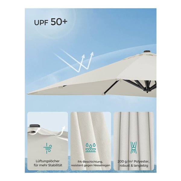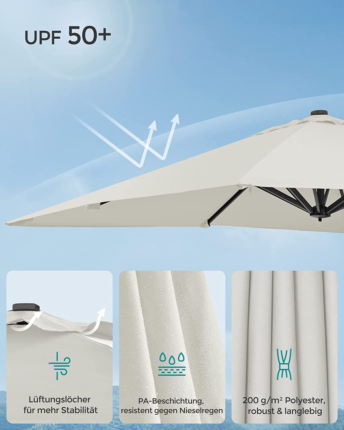 - Constructed from durable material with a UPF 50+ UV protection, you and your guests are shielded from harmful sun rays. The umbrella comes with a sturdy base, fastening straps, and a cover, allowing you to protect it from inclement weather. Available in a lovely beige color, it adds a stylish touch to any garden.