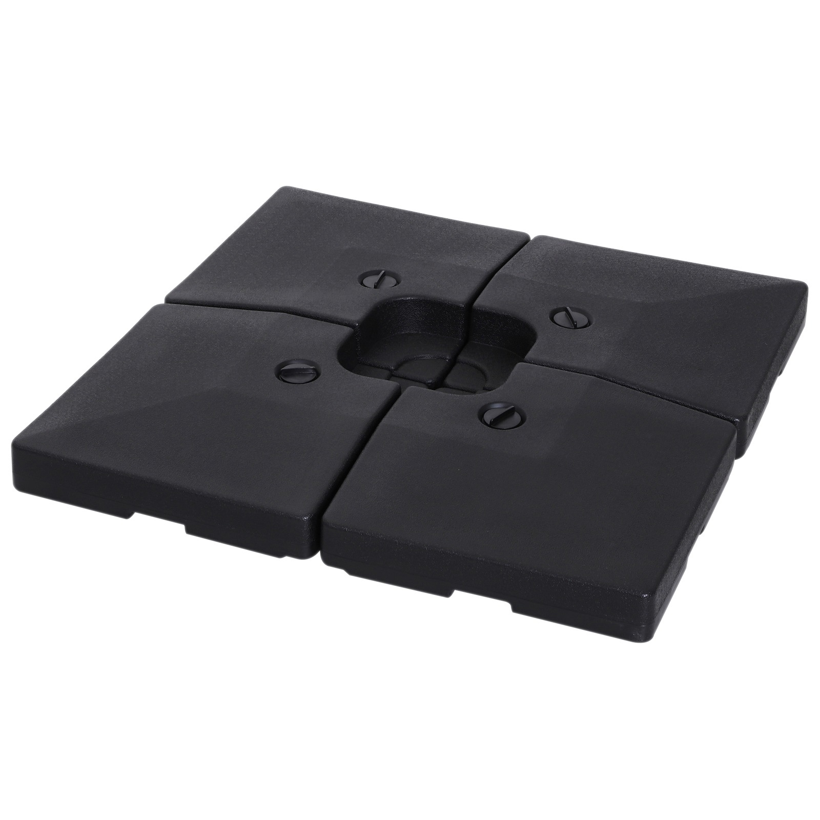 Robuuste en weerbestendige parasolvoet van HDPE-kunststof in 4 delen. Vulbaar met water of zand voor extra stabiliteit. Geschikt voor verschillende parasolbases.