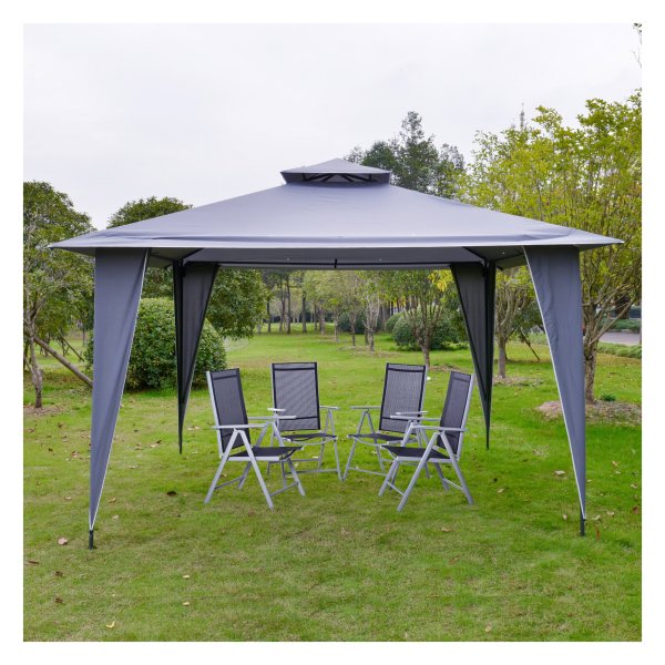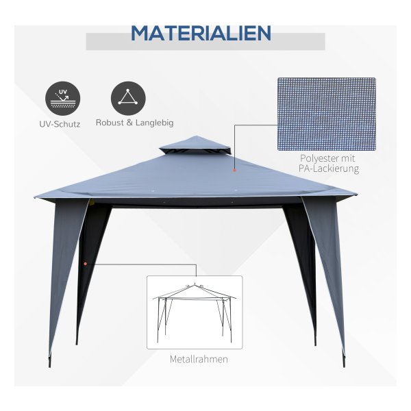 Een ruime, goed geventileerde partytent met robuust metalen frame en UV-bestendige polyester bekleding. Ideaal voor feestjes en buitenactiviteiten. Gemakkelijk op te zetten en stabiel.