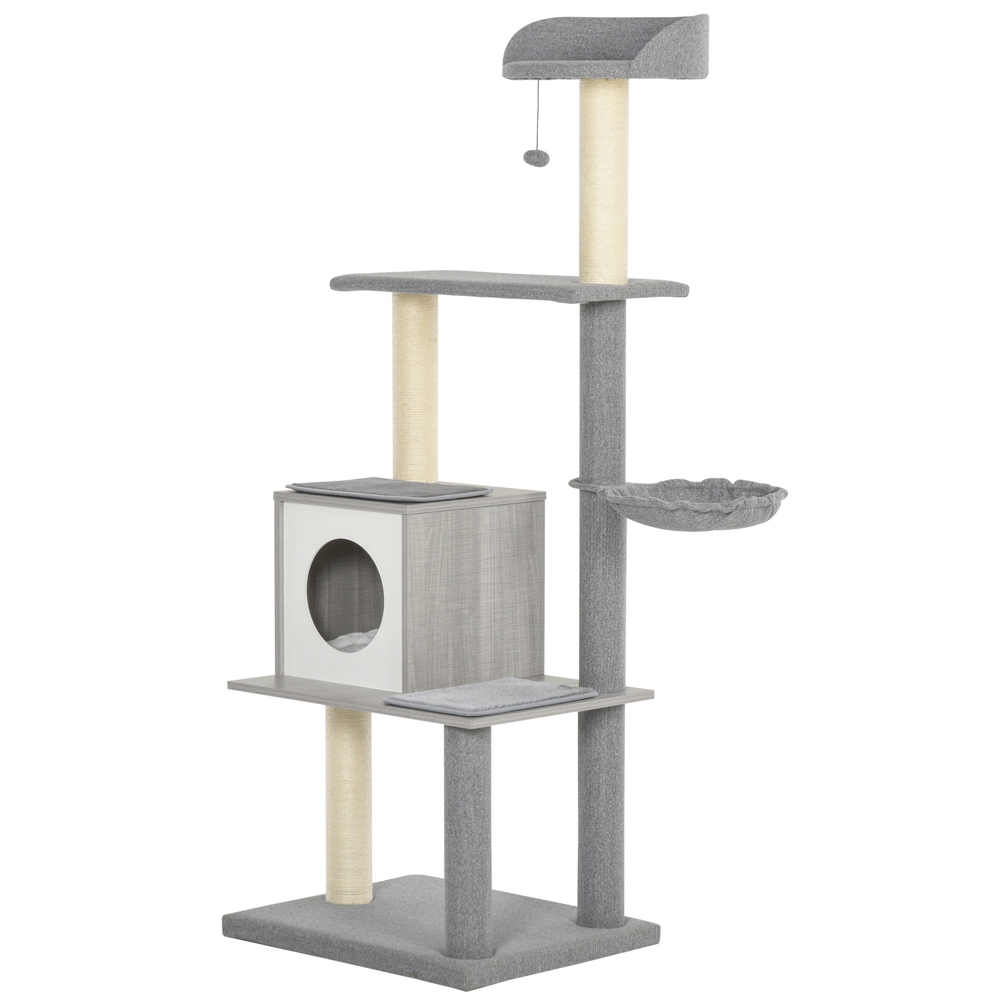 | Bullet Point 3 | De PawHut Krabpaal is niet alleen een fantastische plek voor uw katten om te spelen en te rusten, maar het biedt ook ergonomische voordelen voor zowel de kat als de eigenaar. Met meerdere platformen die ruimte bieden voor luieren en spelen, zorgt deze krabpaal voor een gezonde en stimulerende omgeving voor levendige katachtigen. Het ruime schuilhuis en de kattenbal zorgen voor diversiteit in activiteiten, terwijl de ronde vorm van het kattenhol bijdraagt aan het comfort van de katten. De krabpaal is ontworpen met hoogwaardige materialen, zoals E1-spaanplaat, sisal en pluche, en heeft een draagvermogen dat getest is en voldoet aan kwaliteitsnormen. Met een eenvoudige montage en een stijlvol grijs-wit design dat past bij elke ruimte, is de PawHut Krabpaal de ideale oplossing voor kattenliefhebbers die het beste willen voor hun geliefde huisdieren. |