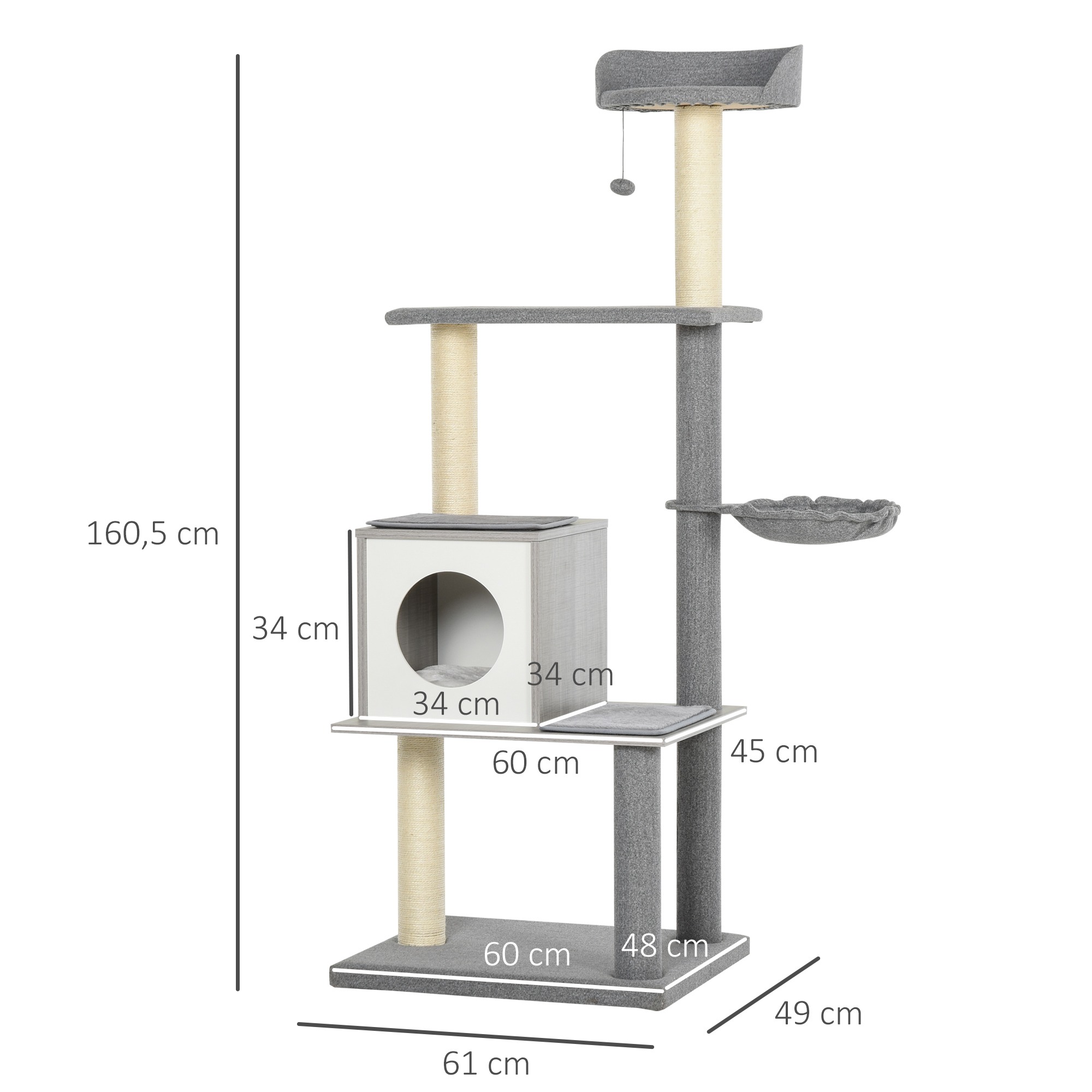 | Bullet Point 4 | Deze krabpaal van PawHut biedt uw katten eindeloos vermaak en een plek om te luieren en te spelen. Met meerdere platformen, een ruim schuilhuis en een kattenbal, is deze multifunctionele krabpaal ideaal voor huizen met meerdere speelse katten. De ronde vorm van het kattenhol en de grijze kleur passen goed in elk interieur. De krabpaal is gemaakt van hoogwaardige materialen zoals E1-spaanplaat, sisal en pluche, en is gemakkelijk te monteren. De afmetingen en technische specificaties worden duidelijk vermeld, zodat u precies weet wat u kunt verwachten. Met deze krabpaal kunnen uw katten naar hartenlust spelen en rusten! |