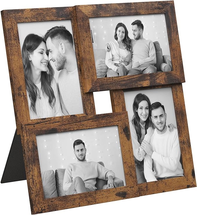 Bullet Point 5 | Wat je krijgt: een fotolijstcollage voor 4 foto's (elke 10 x 15 cm).De fotolijsten hebben een glazen paneel en maken ook indruk op de houtkorrel van het oppervlak.Voor altijd je mooie herinneringen met deze fotolijsten |