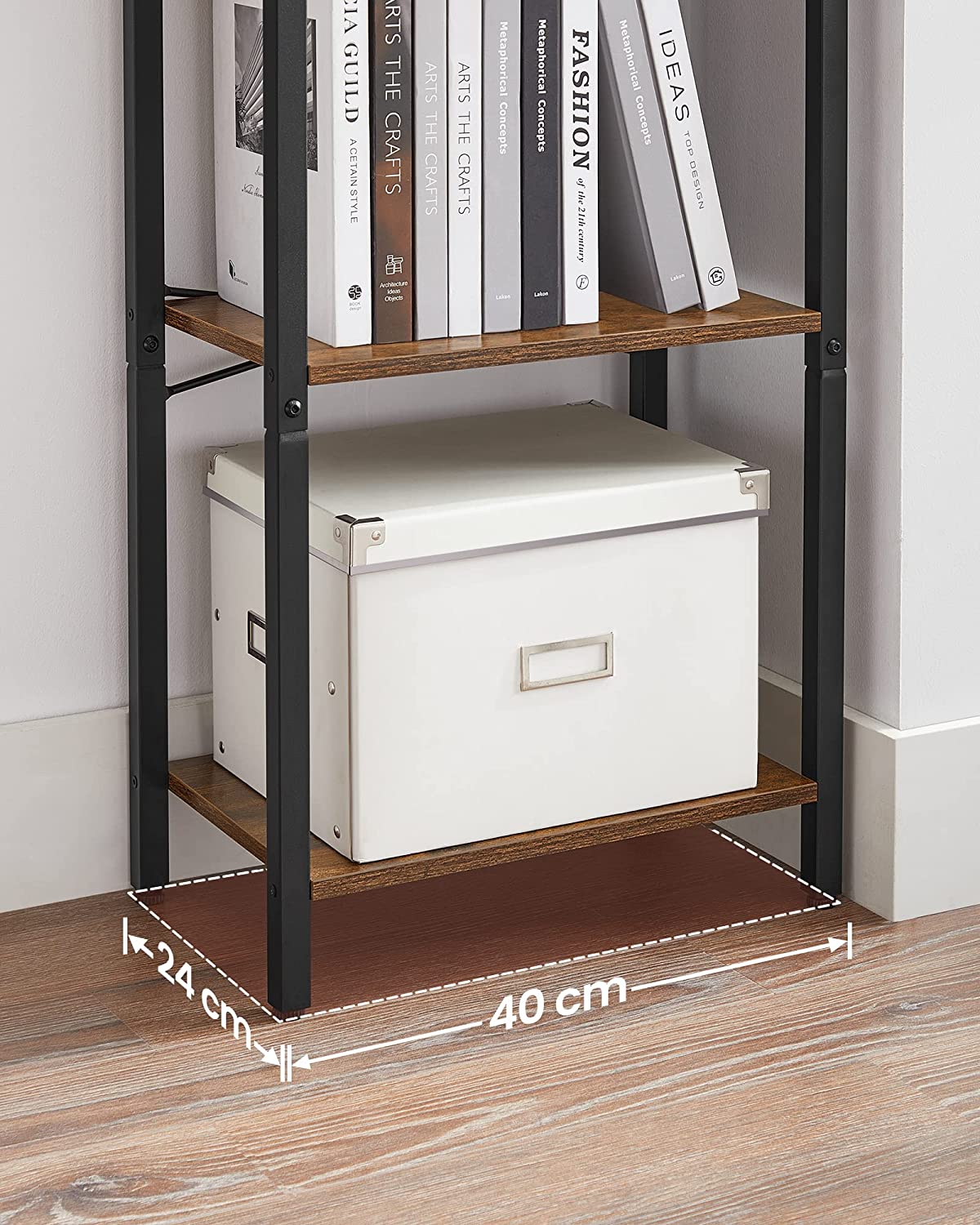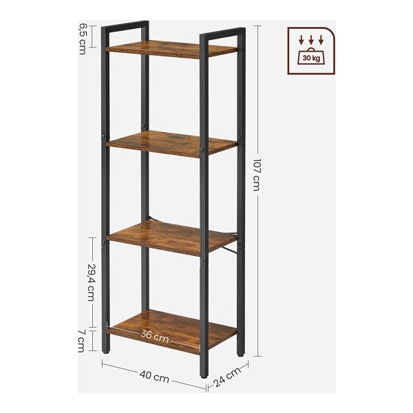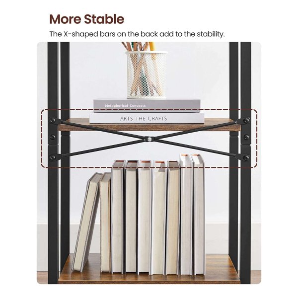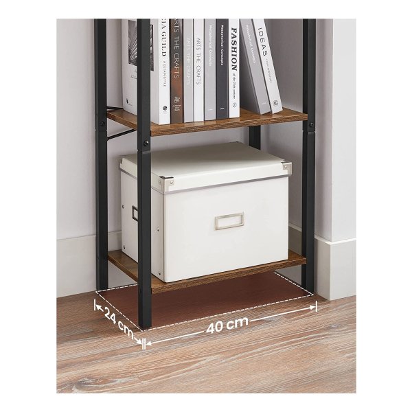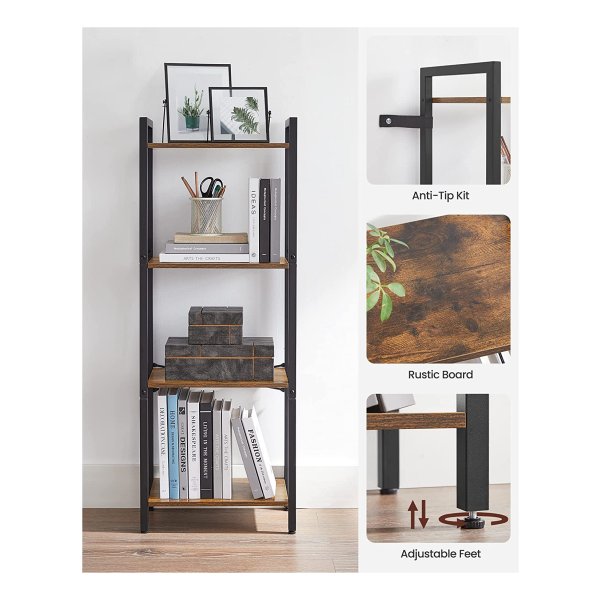 Wat je krijgt: Een smalle legplank met 4 etages in een rustieke look met X-beugel aan de achterkant voor meer stabiliteit en anti-kantelbeveiliging voor extra veiligheid. Het zal elke woonkamer, slaapkamer of studeerkamer laten stralen!