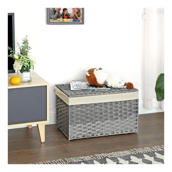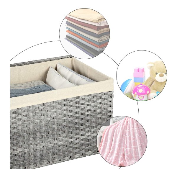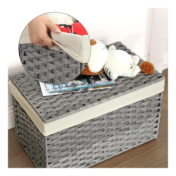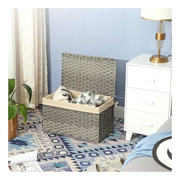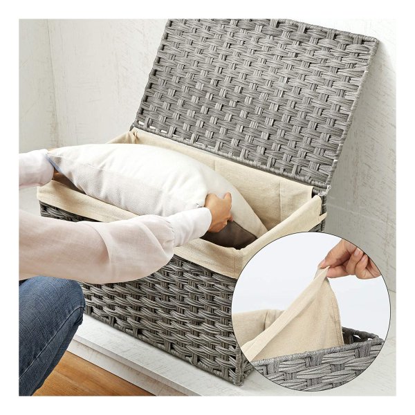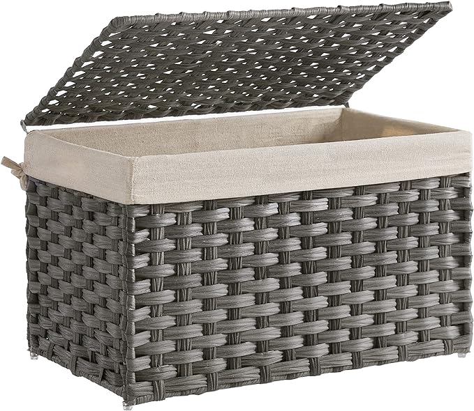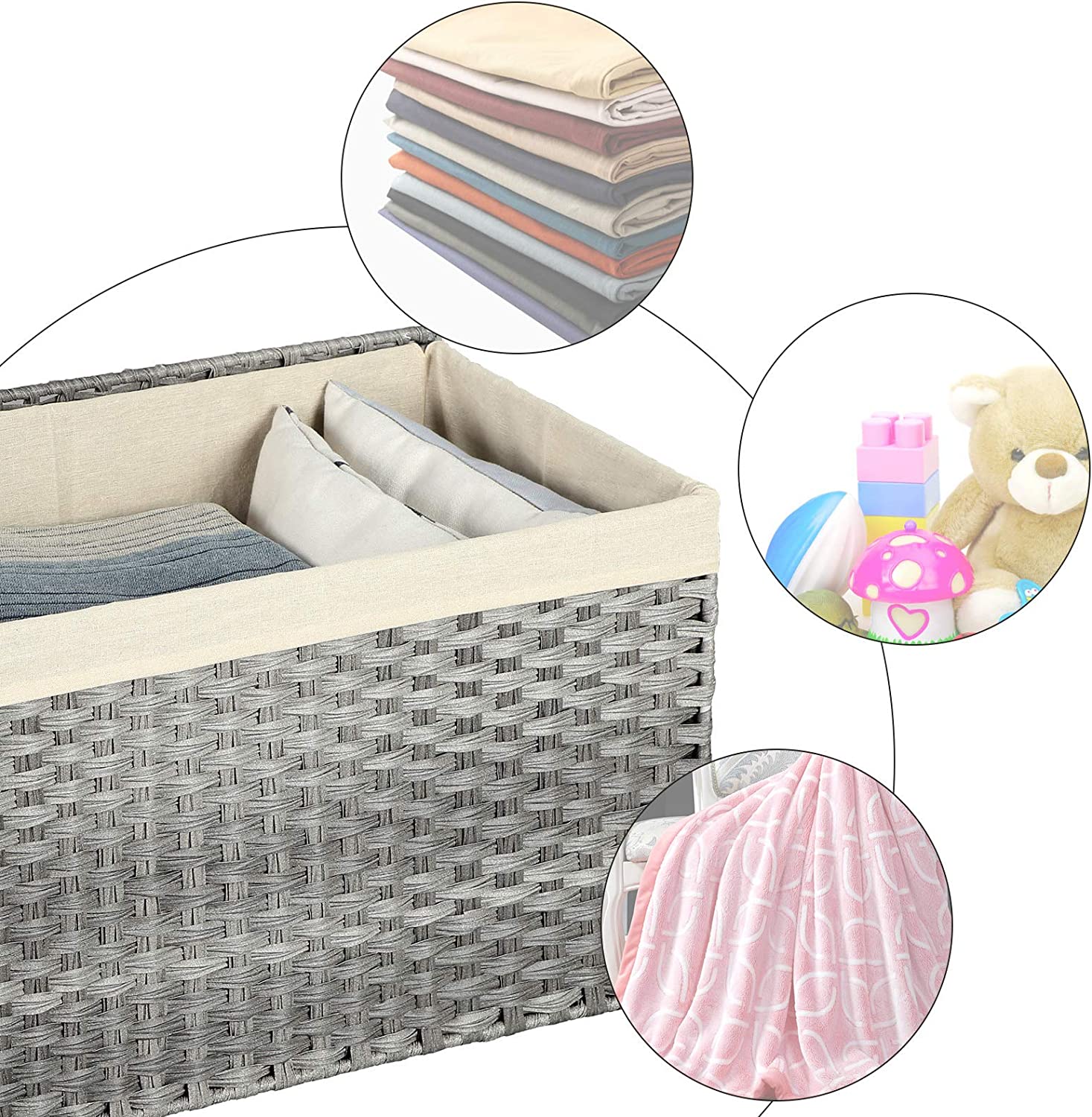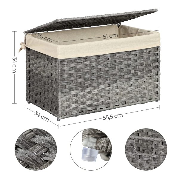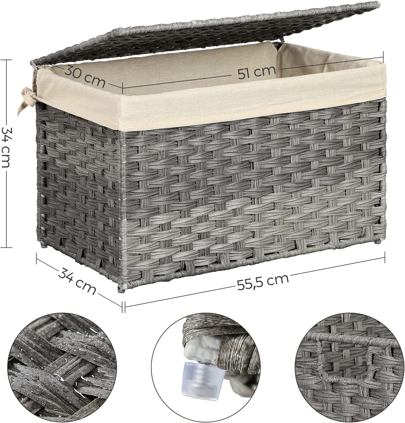 Polyrattan opbergdoos, opbergmand, 65 L wasmand, decoratieve borst met deksel, handgrepen en katoenen tas, rechthoekig, geweven, slaapkamer, wasruimte, grijze rst56wg