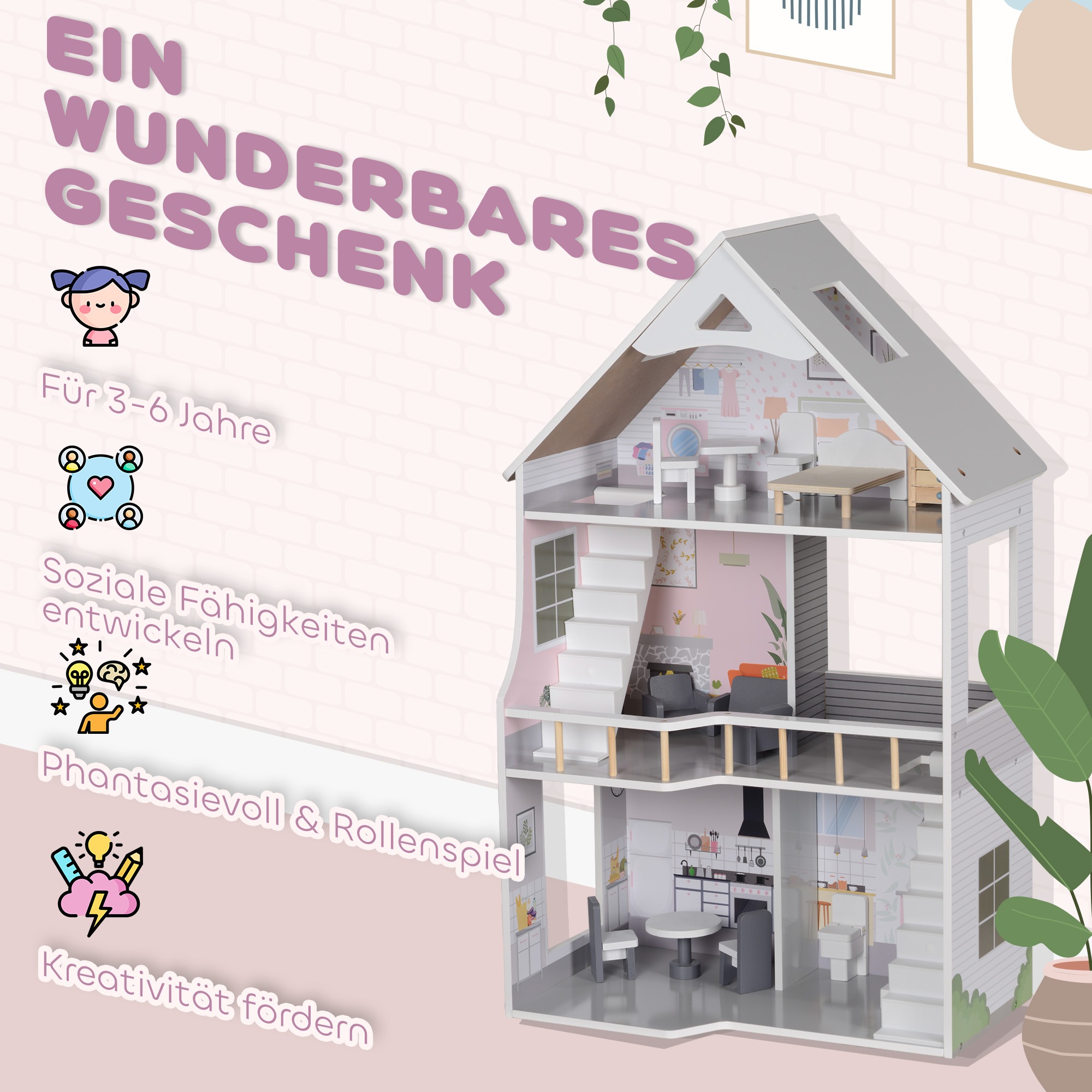 Dit 85,3 cm hoge poppenhuis biedt drie verdiepingen en meubels voor kinderen van 3-6 jaar. Ideaal voor spelen, delen en ontwikkelen van sociale vaardigheden. Veilig gemaakt van MDF en dennenhout.