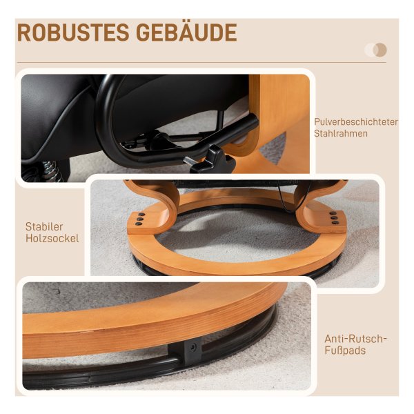 - Sterk en Stabiel: De relaxstoel is gebouwd op een stevige basis van hout en poeder gecoat stalen frame, met beschermende voeten voor vloerbehoud.