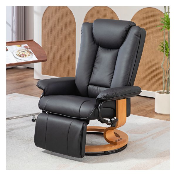 Ervaar ultiem comfort en flexibiliteit met onze draaibare relaxstoel in kunstleder zwart. Deze relaxstoel is de perfecte oplossing voor kleine ruimtes of om een stijlvolle touch toe te voegen aan je interieur. Met een elegante kanteling van 135° en een volledig draaibare 360° basis kun je genieten van optimale ontspanning en mobiliteit. Het hoogwaardige kunstleder geeft de stoel een moderne uitstraling en zorgt tegelijkertijd voor een aangenaam gevoel. Creëer een plekje van rust en verwen jezelf met ontspannende momenten, waar je ook bent in huis.