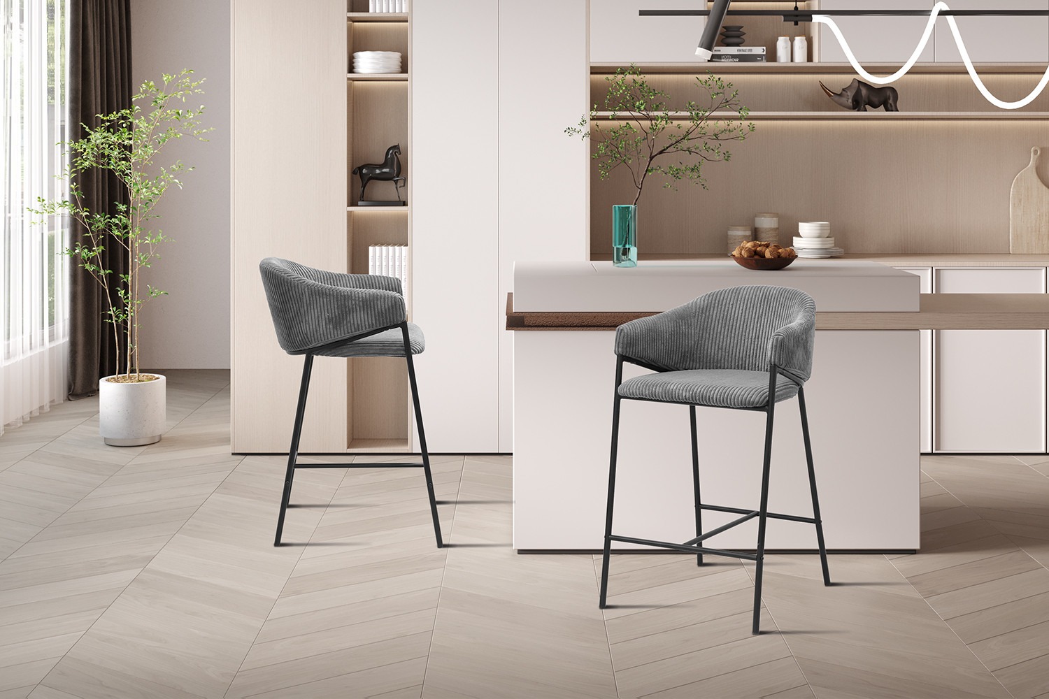 Een comfortabele counterstoel in donkergrijs corduroy met een rugleuning van 90 x 54 x 59 cm. Perfect voor een stijlvolle touch aan je keuken of bar..