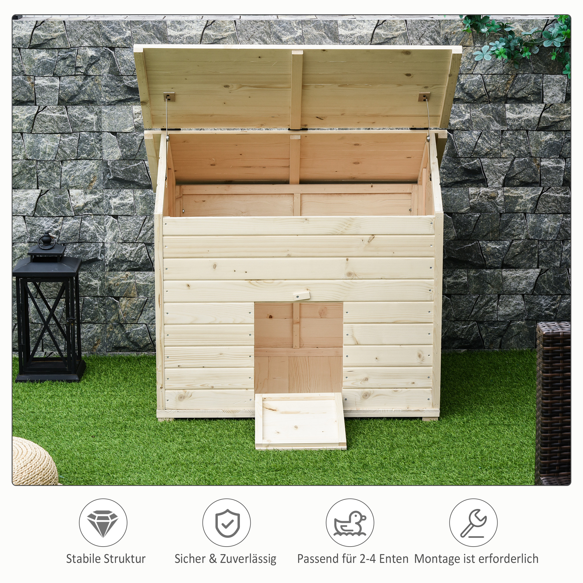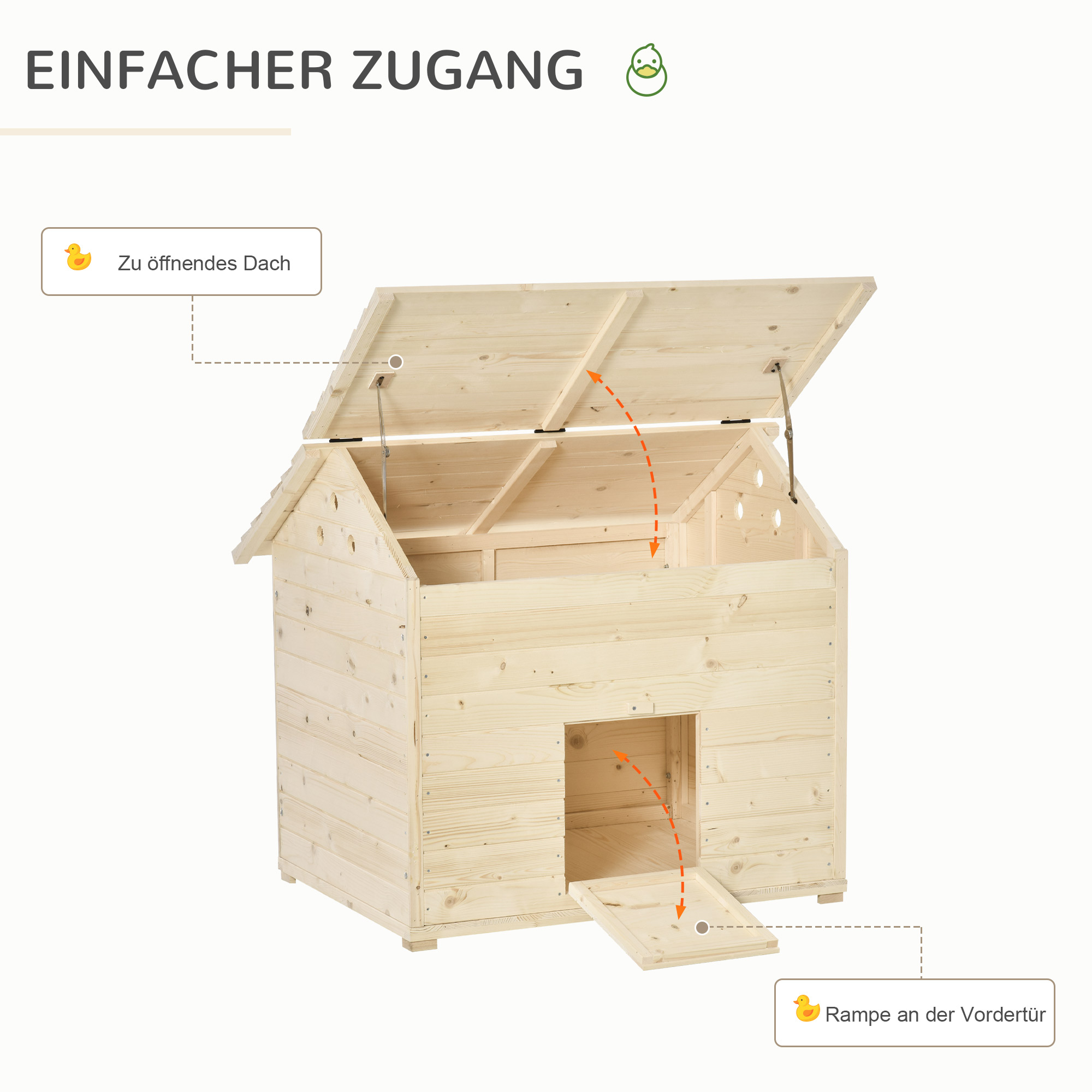 | Bullet Point 5 | Hierdoor hebben uw dieren gemakkelijk toegang tot de stal.VERHOOGDE VLOER: De verhoogde vloer van de stal helpt beschermen tegen vocht en kou. Het voorkomt dat er water in het huis loopt.HOUTEN CONSTRUCTIE: De stal is gemaakt van massief dennenhout. Het materiaal is duurzaam, gemakkelijk te onderhouden en geschikt voor langdurig gebruik.PRODUCTGEGEVENS: Totale afmetingen: 100L x 82,5B x 91H cm. Afmetingen hoofdgebouw: 90L x 70B x 84H cm. Geschikt voor 2-4 eenden. |