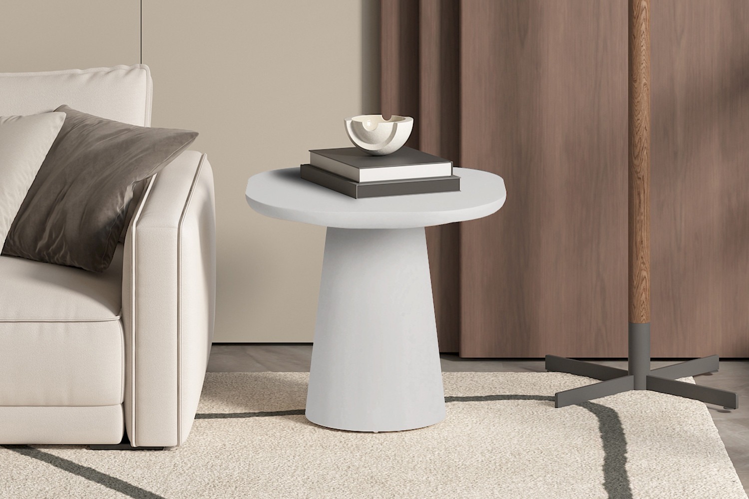 Koop de salontafel ‘Tavira’ in cement ecru, met ovale vorm en afmetingen 55x55x50 cm. Perfect voor een stijlvolle toevoeging aan je interieur..