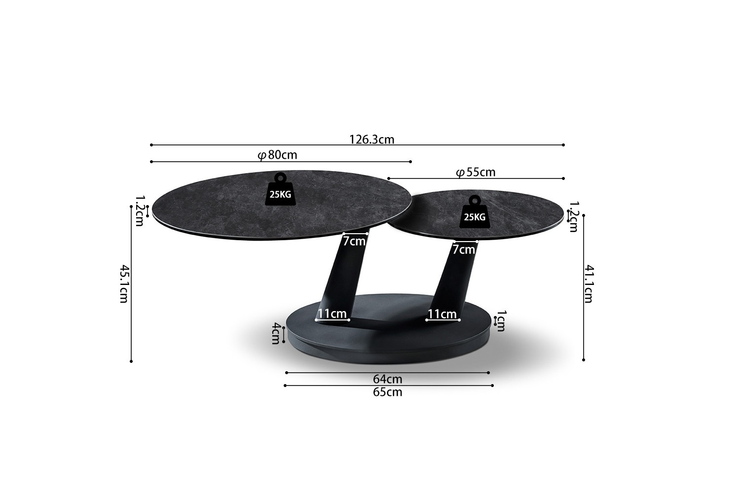 Ronde draaibare salontafel in donkergrijs steen, afmetingen 45 x 80-126 x 80 cm met een top van 12 mm dik, voor €63. 15..