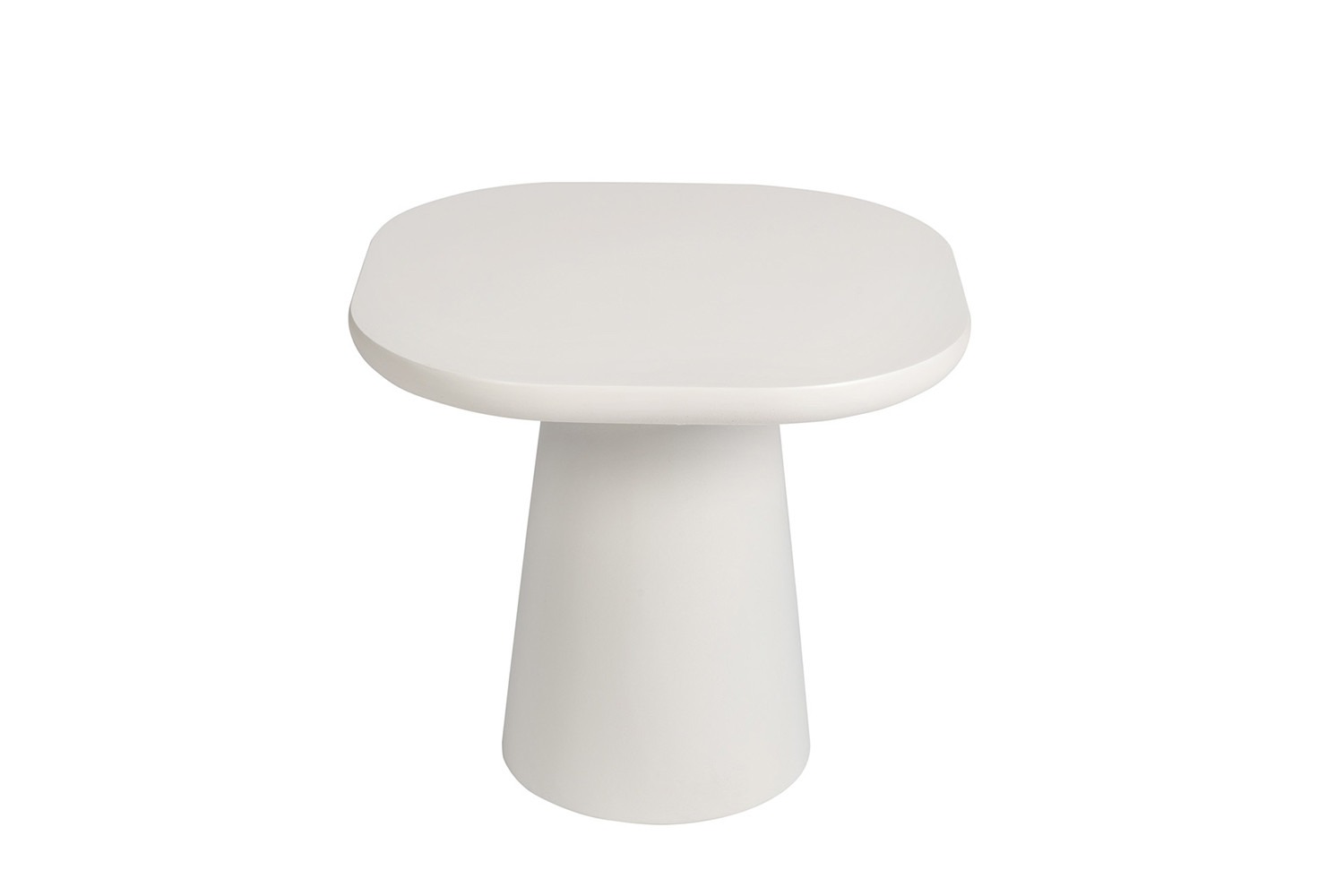 Een ovale salontafel genaamd ‘Tavira’ van 55 cm in cement wit. Afmetingen zijn 50x55x55 cm. Een strak en modern design voor in elk interieur.