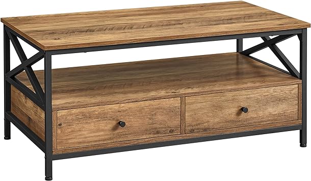salontafel, woonkamer tafel, met 2 laden en open opbergplank, X-vormig stalen frame, 100 x 55 x 45 cm, industriële stijl, rustieke walnoot en zwarte