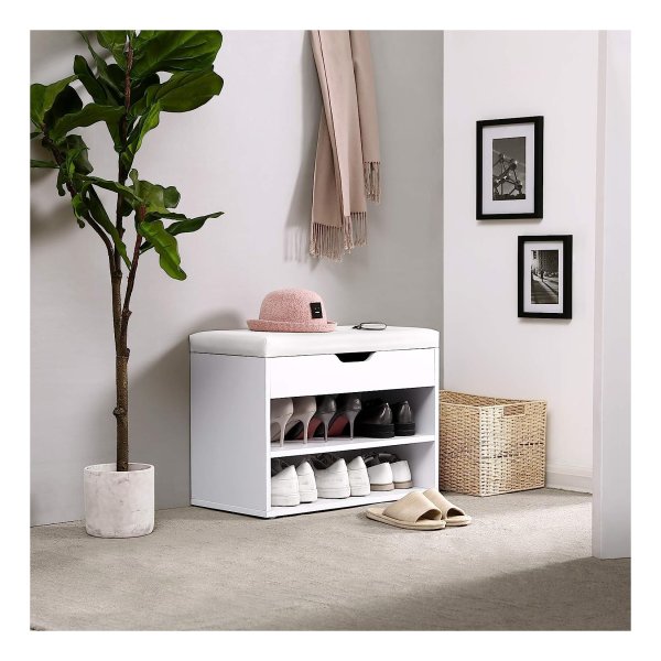- Het klapdeksel is gemaakt van stevig materiaal en heeft een stevige sluiting. De gewatteerde zitting biedt extra comfort en is gemaakt van duurzaam materiaal. De twee vakken in de schoenenplanner zijn ideaal voor het opbergen van verschillende soorten schoenen.