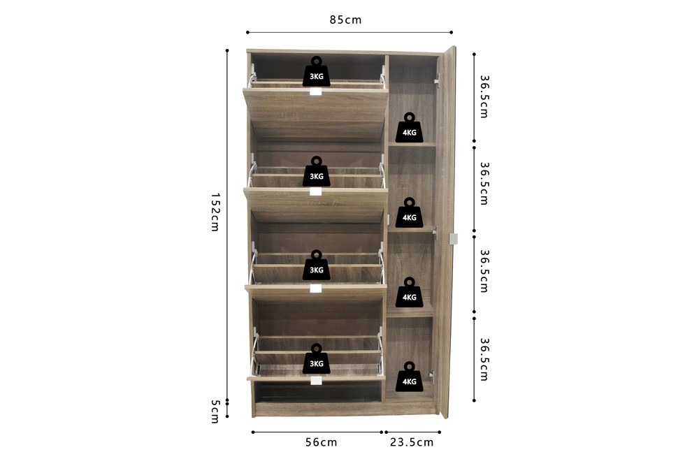 Deze schoenenkast is voorzien van 4 laden en 1 grote spiegeldeur, waardoor je niet alleen jouw schoenen netjes kan opbergen, maar ook een handige spiegel hebt om snel een laatste blik te werpen voordat je de deur uitgaat. De ruime opbergruimte biedt plek aan al jouw favoriete schoenen, van hakken tot sneakers.